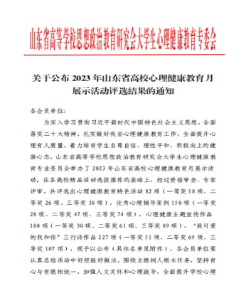 9月11日,山东省高等学校思想政治教育研究会大学生心理健康教育专委会发布了《关于公布2023年山东省高校心理健康教育月展示活动评选结果的通知》,山东华宇工学院共获奖7项,其中一等奖1项,二等奖2项,三等奖4项。学生处党支部教师党员王冠、牛秋云的心理案例《从精神分析动力学角度 为“心”赋能 蝶变新生——记一例严重心理问题学生的咨询案例》荣获优秀心理辅导案例三等奖;王冠、王君、牛秋云指导的心理健康教育特色活动《从“心”出发 关爱陪伴 守护成长》荣获三等奖。