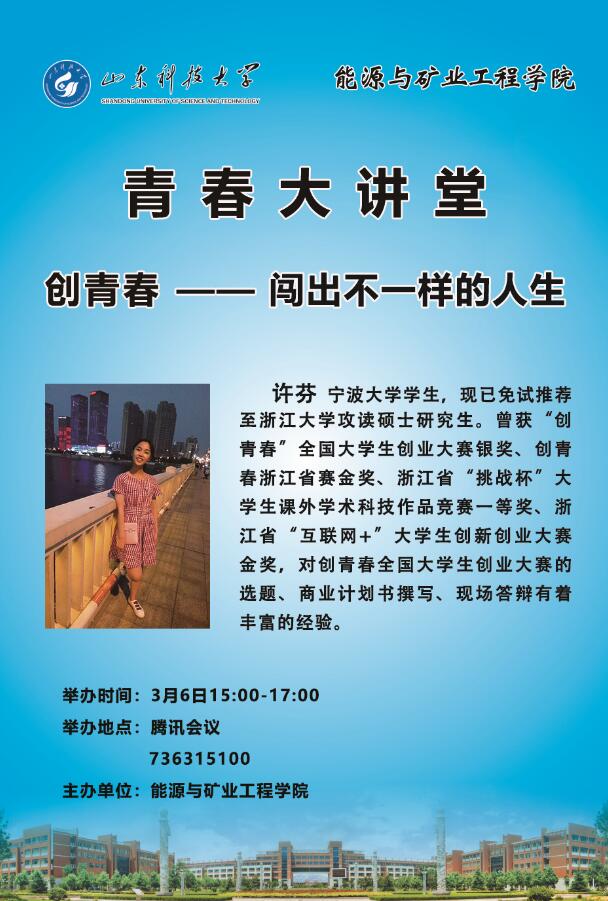 月6日下午,能源学院“创青春”大学生创业大赛指导讲座在腾讯会议平台举办。宁波大学校团委王飞老师、山东科技大学校团委李之鹏老师、能源学院团委书记马鹤以及学校近300名师生参与网络会议。会议邀请宁波大学2016级学生许芬担任主讲。