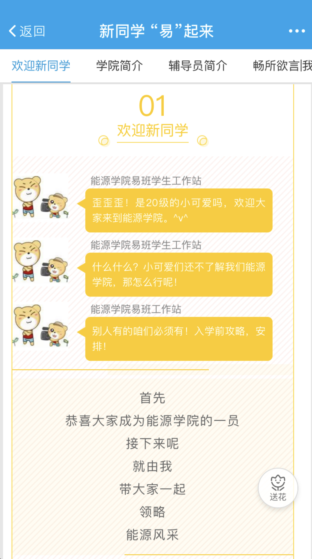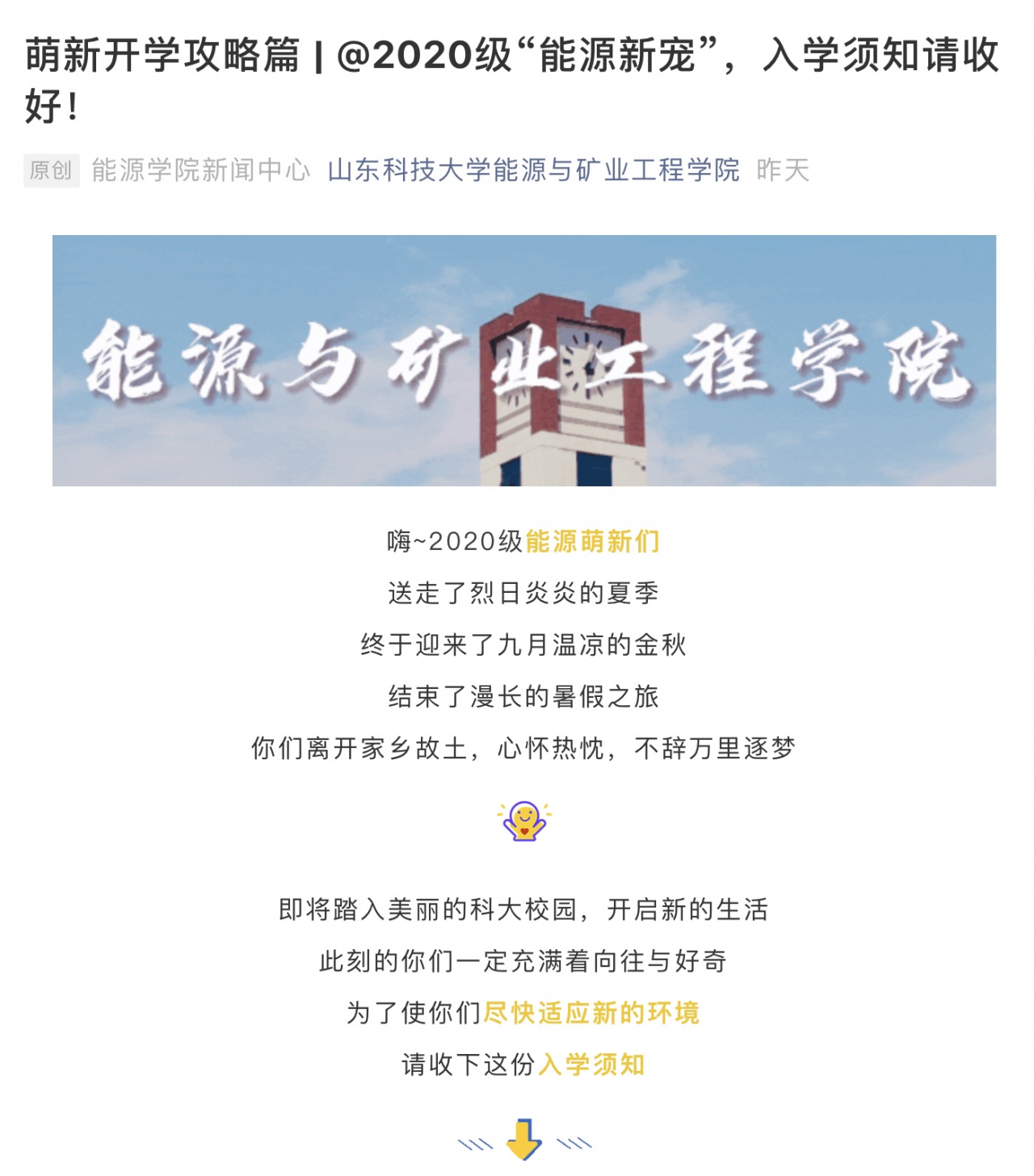 为了让新生入校后尽快融入大学生活,尽早适应校园学习和生活环境,“云”迎新也采取了新媒体宣传方式。能源学院利用微信公众号、抖音等大家喜闻乐见的平台,推送新生攻略,从疫情防控、入学报到、开学必备物品、校园生活指南、入学安全和宿舍安排六个方面为2020级新生提供开学攻略。