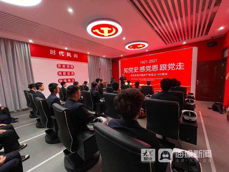5月24日,记者来到位于济南市长清大学城的山东劳动职业技术学院,在党史学习教育VR学习体验中心,记者看到,教室内设置了25个可自由旋转的座椅,学生们佩戴好VR眼镜,通过手柄选择党课内容,便可以进行“实景”党课的学习了。