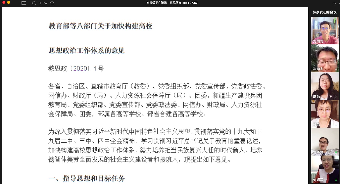 初等教育学院学工党支部围绕“六度空间”支部工作模式,落实“四每工作机制”,严格每月一次支部理论学习。2020年5月29日下午3:00,支部以视频会议的形式召开了五月的主题学习,支部全体党员刘婧媛、韩录、鲁华夏、崔坤杰、陈源、刘雨龙参加了本次理论学习。本次学习会由支部书记韩录同志负责主讲。