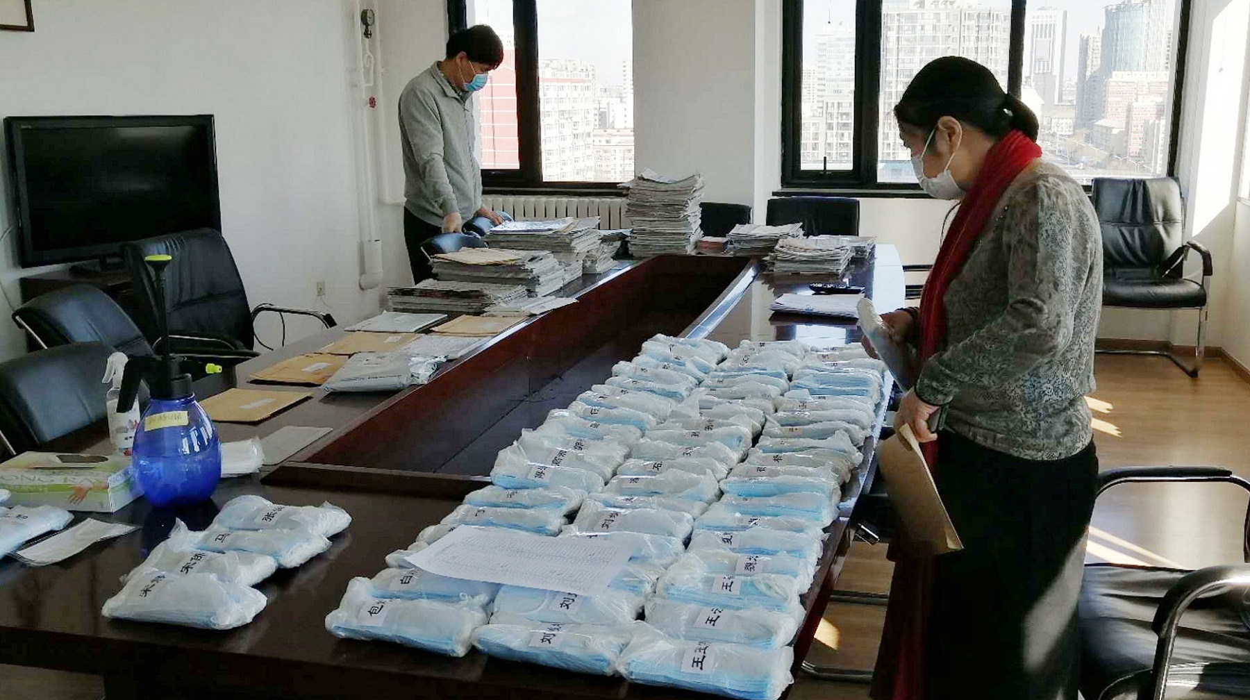 学院工会主席邱文、院办公室杨国志老师,细心的为140名教职工包装好口罩,并根据老师们的需求分别将口罩放置在老师的个人信箱及值班室,供老师们领取。