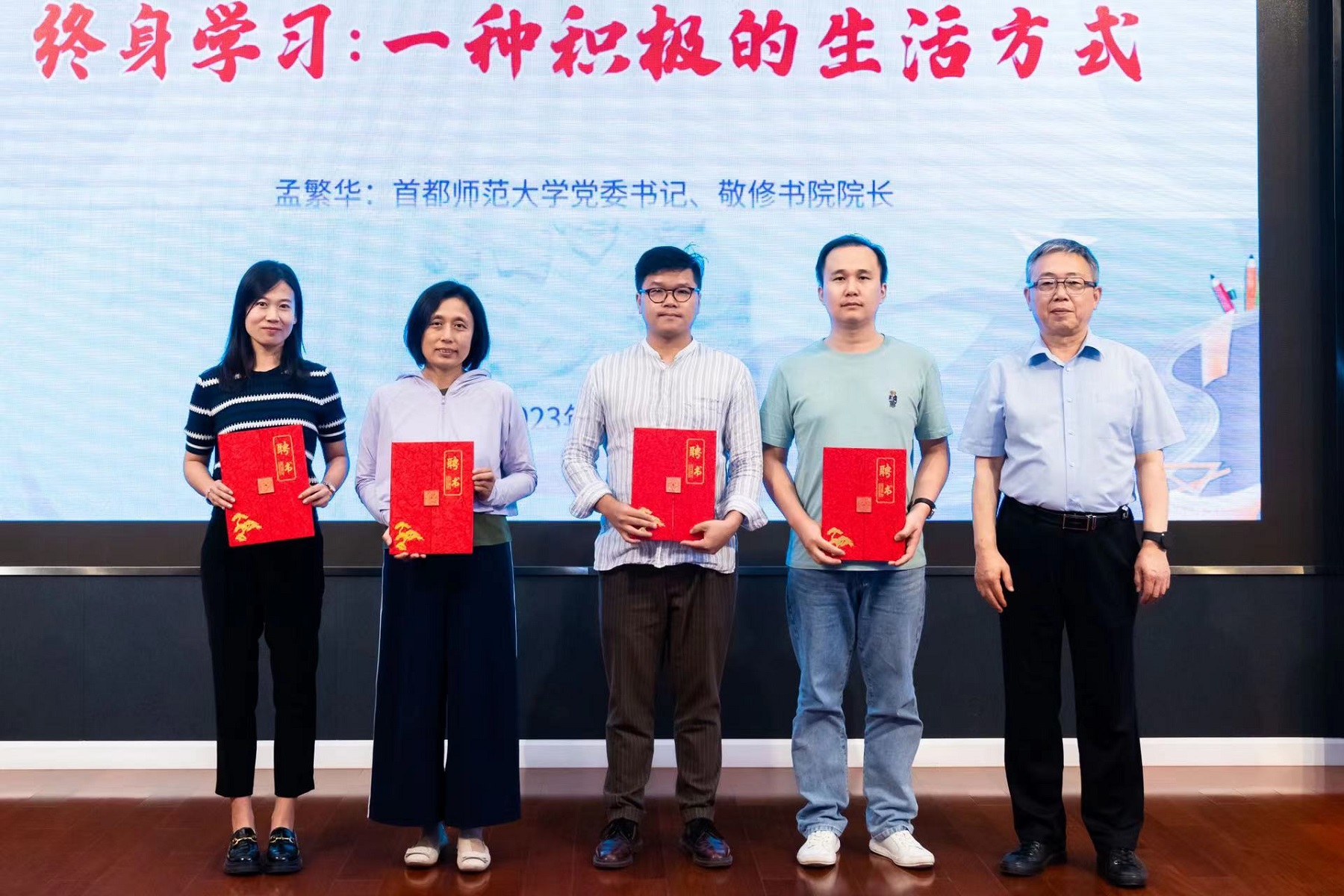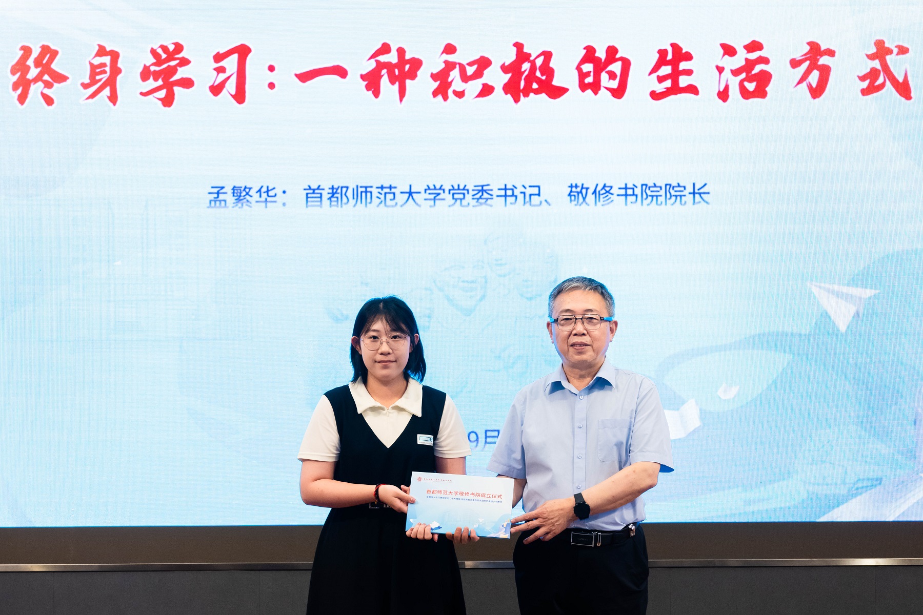 讲座后,孟繁华为敬修书院新聘导师李玉华、罗涛、苏萌萌、谭笑四位导师代表颁发聘书;书院学生代表马尚、王菁现场分享了学习感受;敬修书院新生代表牛越同学向孟繁华赠送书院全体师范生签名纪念册,对孟书记及领导老师一直以来的关心和支持表示感谢,并表示不负学校期望,在书院平台上积极进取,学有所成。