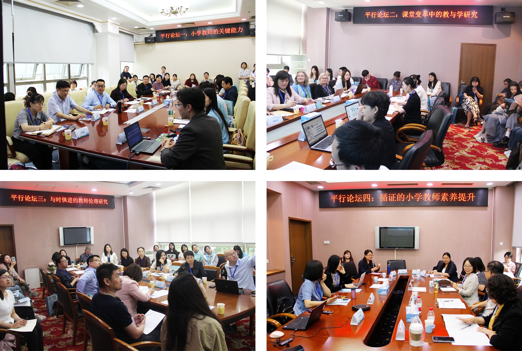 与此同时,四个分论坛并行展开。平行论坛一以小学教师的关键能力为题,平行论坛二关注课堂变革中的教与学研究,平行论坛三关注与时俱进的教师伦理研究,平行论坛四强调了循证的小学教师素养提升。平行论坛特邀了一部分国内外专家进行发言,也遴选了部分会议论文进行会议发表。之后,四个圆桌论坛在各平行论坛同时进行,与会专家进一步围绕卓越小学教师培养的理论与实践展开对话。