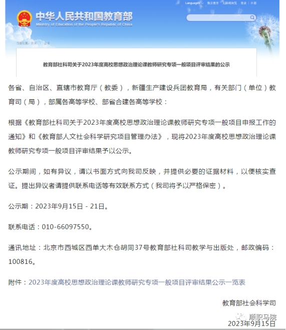 周紫玲副教授主持的课题《生成式人工智能背景下高校思政课教学改革创新研究》获教育部社科司关于2023年度 理论课教师研究专项一般项目立项。