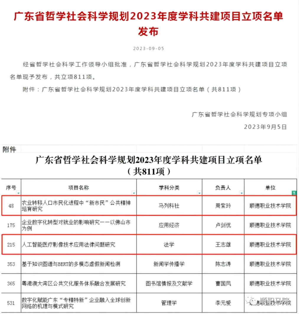 王志雄教授主持的课题《人工智能医疗影像技术应用法律问题研究》和周紫玲副教授主持的课题《农业转移人口市民化进程中“新市民”公共精神培育研究》项目获广东省哲学社会科学规划2023年度学科共建项目立项。