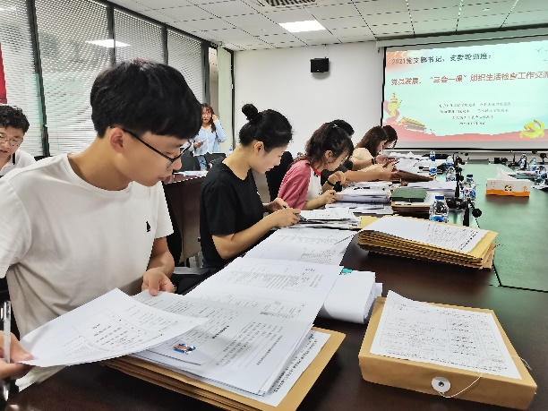 交流会上,大家交叉互检,认真查看了2020、2021两个年度的党员发展档案、“三会一课”记录本等文书资料,并就共性问题、疑难问题进行了现场交流和分享。