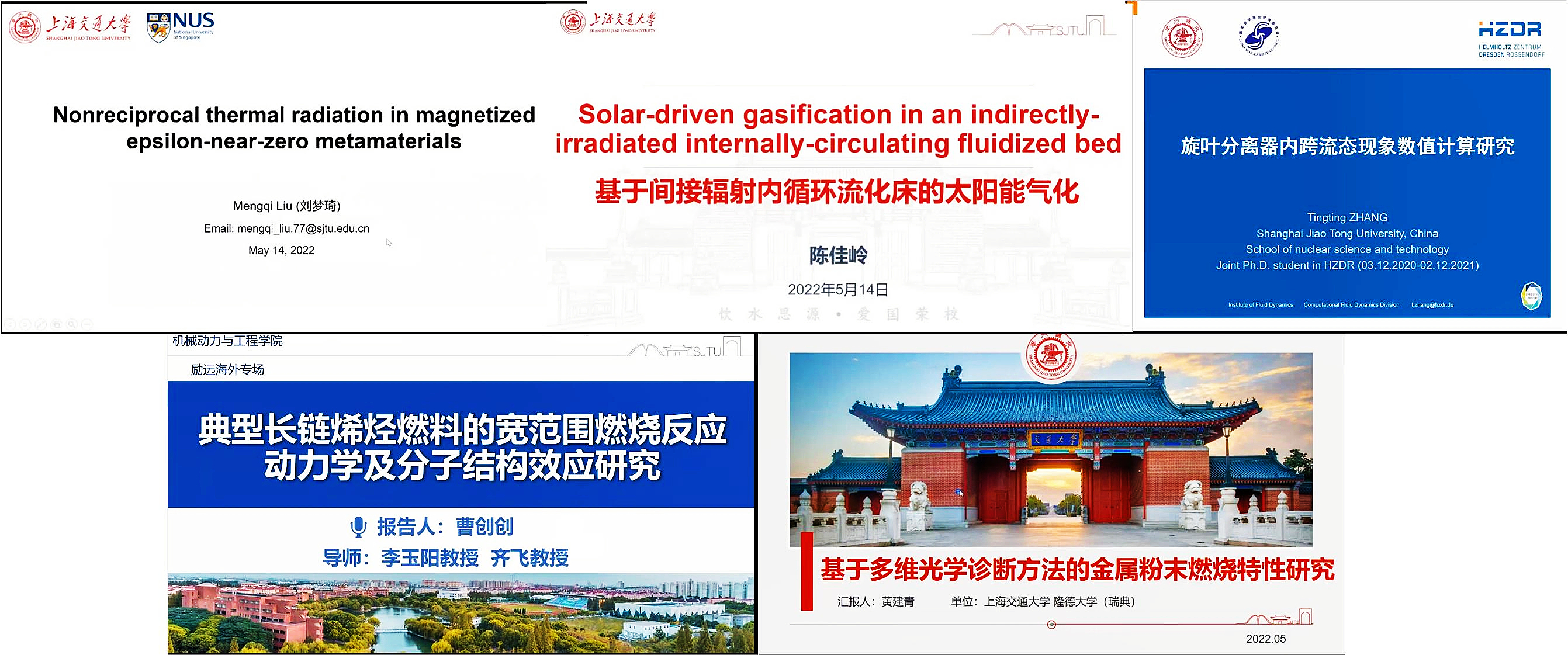 上海交通大学机械与动力工程学院制冷与低温工程研究所博士研究生陈佳岭、航空动力研究所博士研究生曹创创、工程热物理研究所博士研究生刘梦琦、核科学与工程学院博士研究生张婷婷、叶轮机械研究所博士研究生黄建青,分别围绕“基于间接辐射内循环流化床的太阳能气化技术”、“典型长链烯烃燃料的宽范围燃烧反应动力学及分子结构效应研究”、“近零磁化超材料中的非互易热辐射技术”、“叶片式气液分离器形态自适应混合模型的验证技术”、“基于多维光学诊断方法的金属粉末燃烧特性研究”进行了分享。