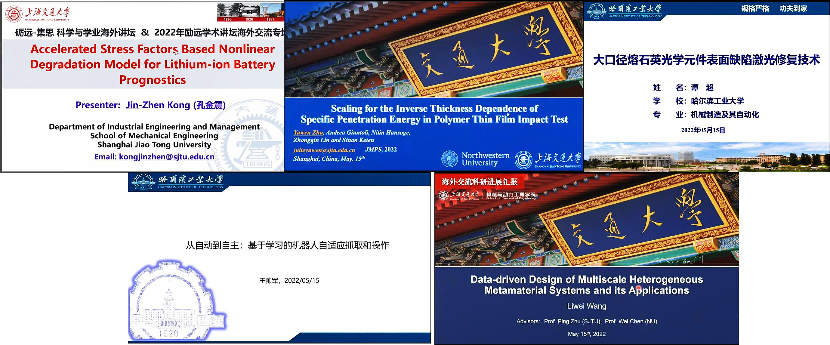 哈尔滨工业大学博士研究生王帅军、谭超,上海交通大学机械与动力工程学院薄板结构制造研究所博士研究生朱宇文、智能汽车研究所博士研究生王力为、工业工程与管理系博士研究生孔金震,分别围绕“机器人从自动到自主的自适应抓取和操作技术”、“高功率激光装置中熔石英光学元件表面缺陷激光修复技术研究进展”、“在聚合物薄膜冲击试验中、比穿透能与厚度成反比关系的标度研究”、“数据驱动的多尺度非均质超材料系统设计及其应用研究”、“基于加速应力因子的锂离子电池非线性退化预测模型的研究”进行了分享。