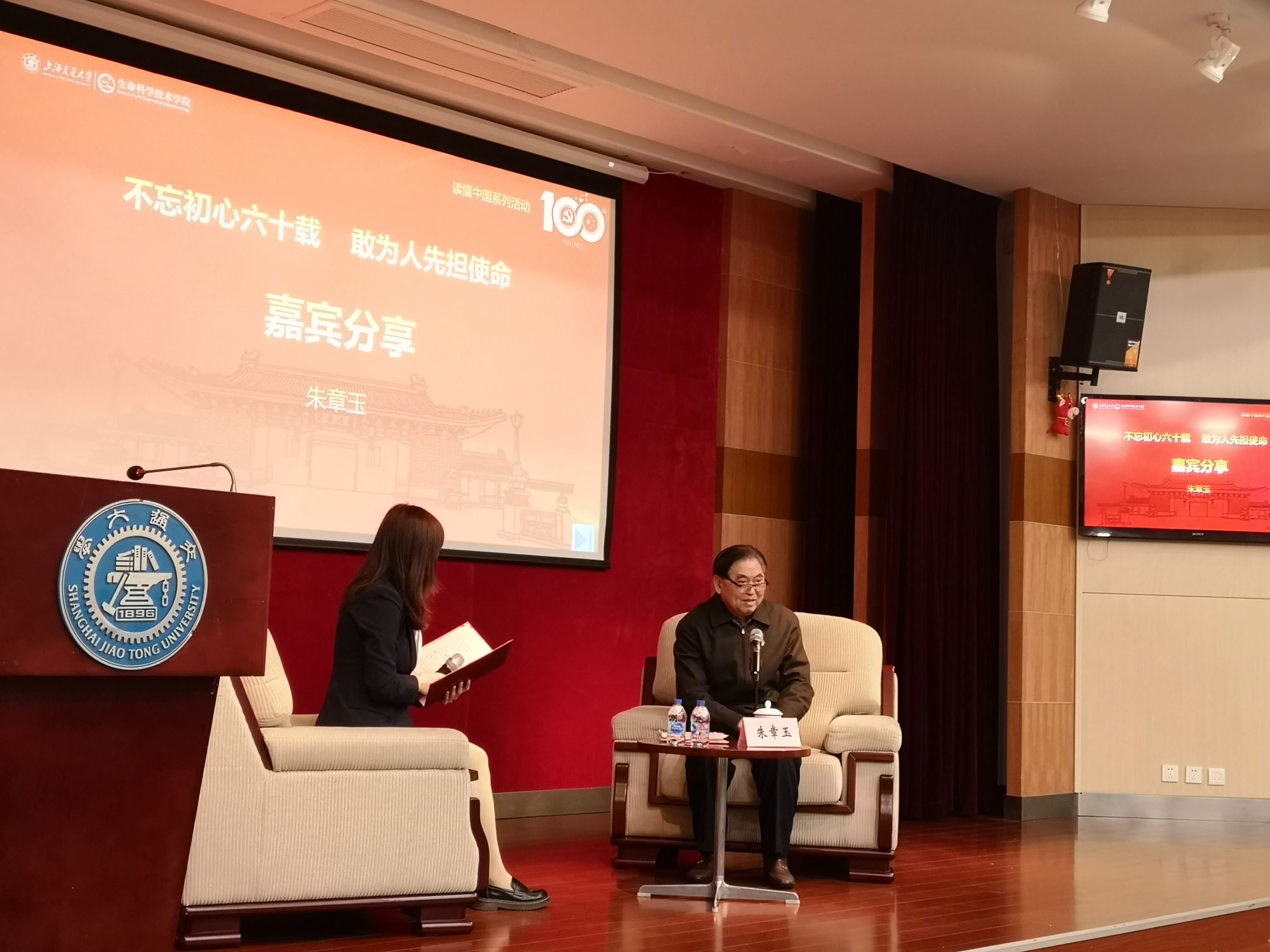 活动开始,同学们通过一段视频了解了朱章玉参与从无到有建设生命科学技术学院的奋斗历程。随后,朱章玉以“不忘初心六十载,敢为人先担使命”为题,向即将毕业启航的同学们分享了入党六十年来的学习工作经历和感悟。谈及自己的入党初心,朱章玉满怀深情,对党和人民的培养充满感恩,经常反省自己”像不像一个党员“、”像不像一个交大学生“,把为党和国家的事业奋斗终身作为己任;朱章玉谈及钱学森学长来信对他在交大建立生命学科的肯定与鼓励,并将殷切的期许托付给在座的毕业生,希望同学们秉持忠诚于党、忠诚于人民、忠诚于祖国的初心,带着讲实话、做实事、凭实干的精神,处理好自信心、适应性、容忍度之间的关系,以自己的真才实学奋斗终身,为祖国的现代化做出自己的贡献。他表达了对毕业同学们身体健康和精神充实的祝愿,并呼吁同学们要继承前辈勇于担当、初心不改的坚韧精神,将生科人的优良传统薪火相传。