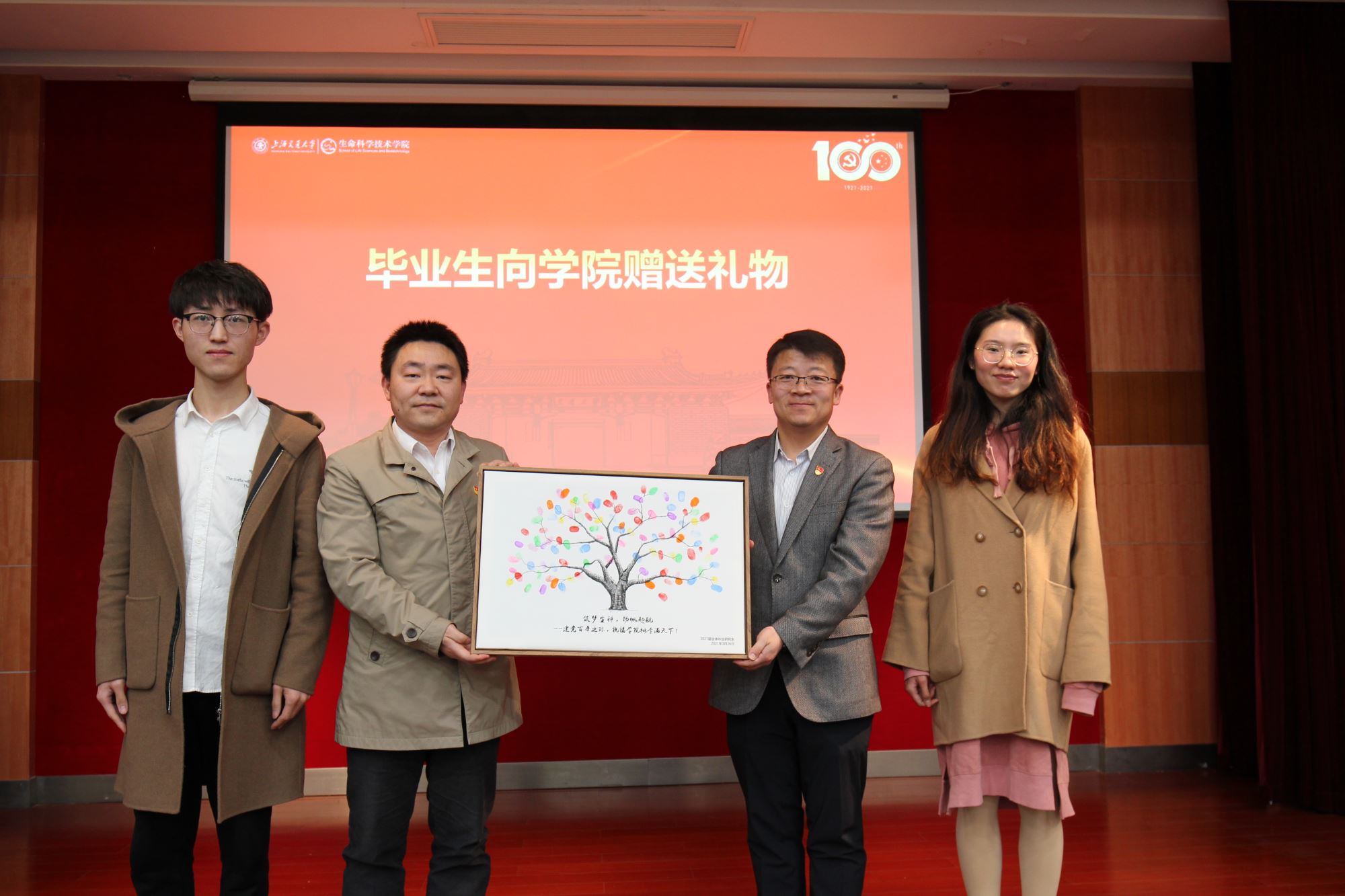 会上,学院与毕业生互赠礼物。为鼓励同学们积极开展党史学习,用党的实践创造和历史经验启迪智慧,学院为毕业生赠送经典书籍《苦难辉煌》,并为每位毕业生定制刻有学院名字和学生姓名的个性化戒指。为感谢学院的悉心栽培,2021届研究生精心准备了一幅写有“筑梦生科,扬帆起航——建党百年之际,祝福学院桃李满天下” 的画。画布上留存的是2021届研究生缤纷错落的彩色手印,寓意生科人携手奋进,共同撑起肩上重任的志向与胸怀,承载着毕业生对学院桃李满天下的美好祝愿。