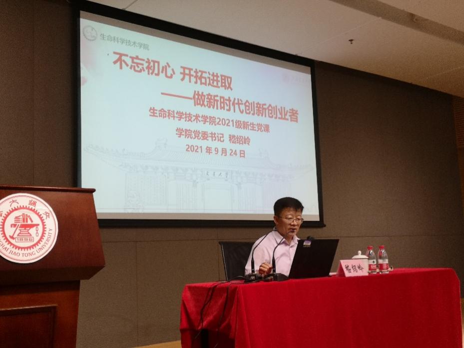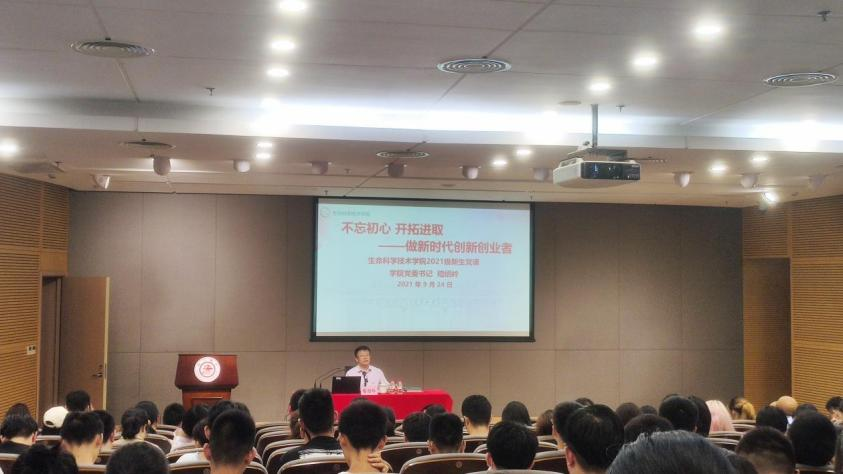 2021年9月24日,生命科学技术学院党委书记嵇绍岭以“不忘初心 开拓进取——做新时代创新创业者”为题,为学院2021级新生讲授了“书记第一课”。