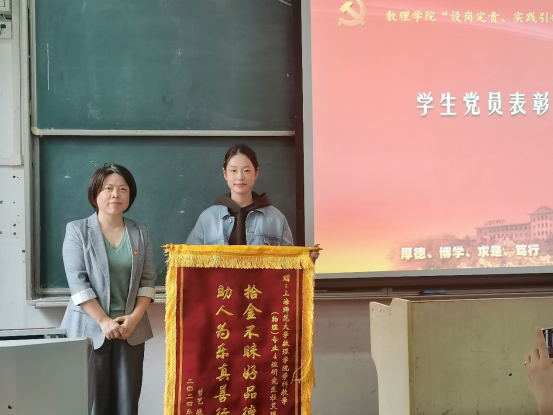 会上数理学院党委书记唐洁还为杜艾瑶同学颁发了“拾金不昧”锦旗。杜艾瑶同学之前在校外的共享单车上捡到了失主的背包并主动交给附近派出所,帮助失主顺利找回遗失物品,展现了党员的高尚品质和良好风范。此举为学院学生党员树立了良好的榜样,传递了正能量。相信在全体师生党员的共同努力下,今年的设岗定责活动将顺利开展,为学院的党建工作注入新的动力。