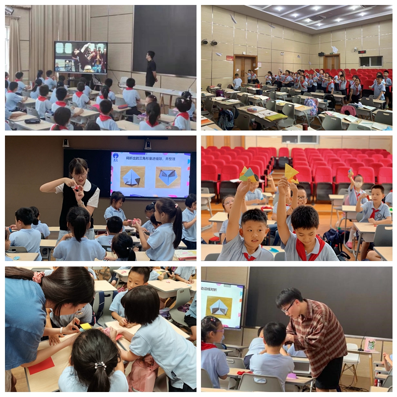 目前,数理学院已经在上师大一附小、康宁科技实验小学开展多次“爱心晚托”活动,得到了同学们的热烈反响。折纸课程上,志愿者们从世界纸飞机大赛视频欣赏,引出纸飞机类型的介绍,无一不吸引着学生的目光。后续课程中,还讲解了立体爱心和直角三角形的折叠,同学们将自己单独完成的直角三角形与同伴的三角形拼合在一起,创造更加丰富的图形,在图形组合的过程中享受与他人合作的乐趣。志愿者教员们耐心教导,学生们收获满满。