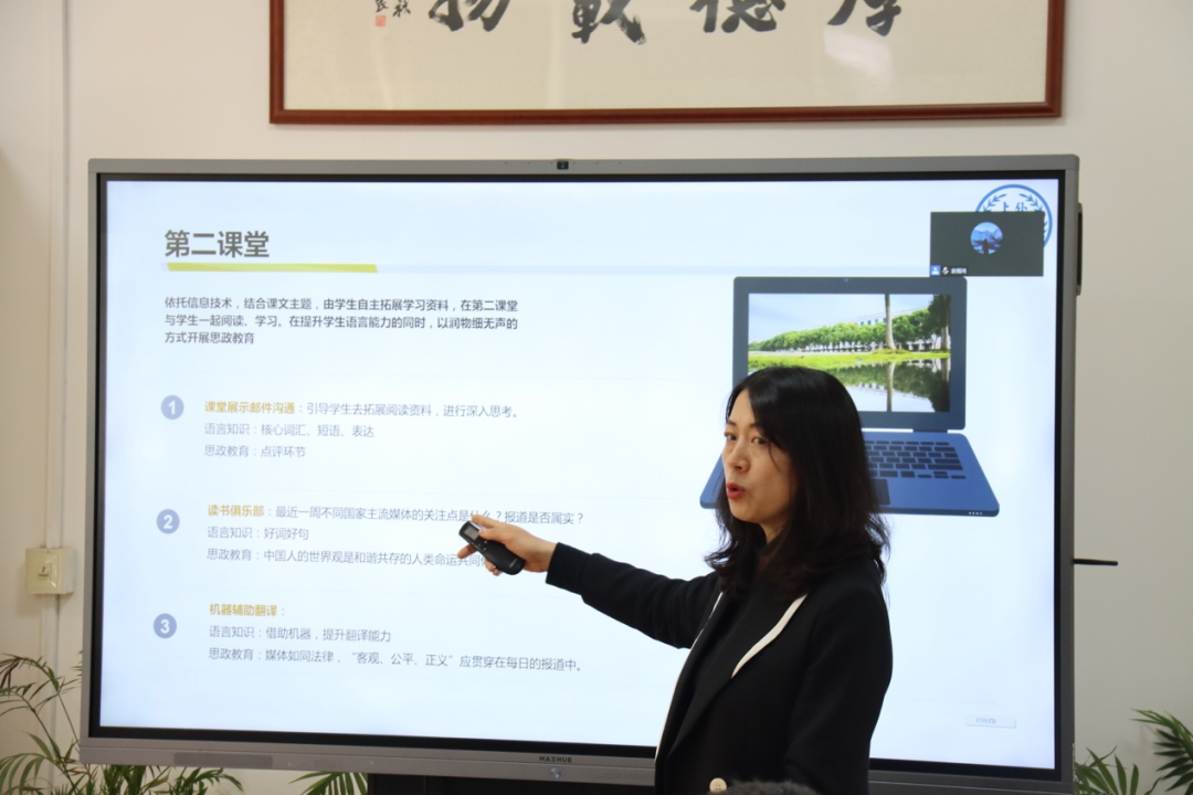 刘媛媛老师首先阐述了她对“课程思政”的理解。“专业课程的课程思政是专业课,首先要上好专业课,在此基础上挖掘思政元素。课程思政不是课堂思政,要在实践、课外、课后推进持续推进。”在此思想引领下,她设置了课程思政的四个目标——语言知识目标、综合知识目标、思政教育目标、师生共成长目标。语言知识目标即培养学生的高层次的语言技能;综合知识目标即课程思政要从学生的认识论方面着手,考虑其专业知识背景和个人背景等;思政教育的目标即思政元素融入课程,正如“盐融于汤”,此处的“盐”和“汤”即思政元素和专业课,此外再结合社会现实,积极开拓第二课堂;师生共成长即培养学生文化自信,使其得以平视世界,同时教师在过程中也不断提升师德师能。