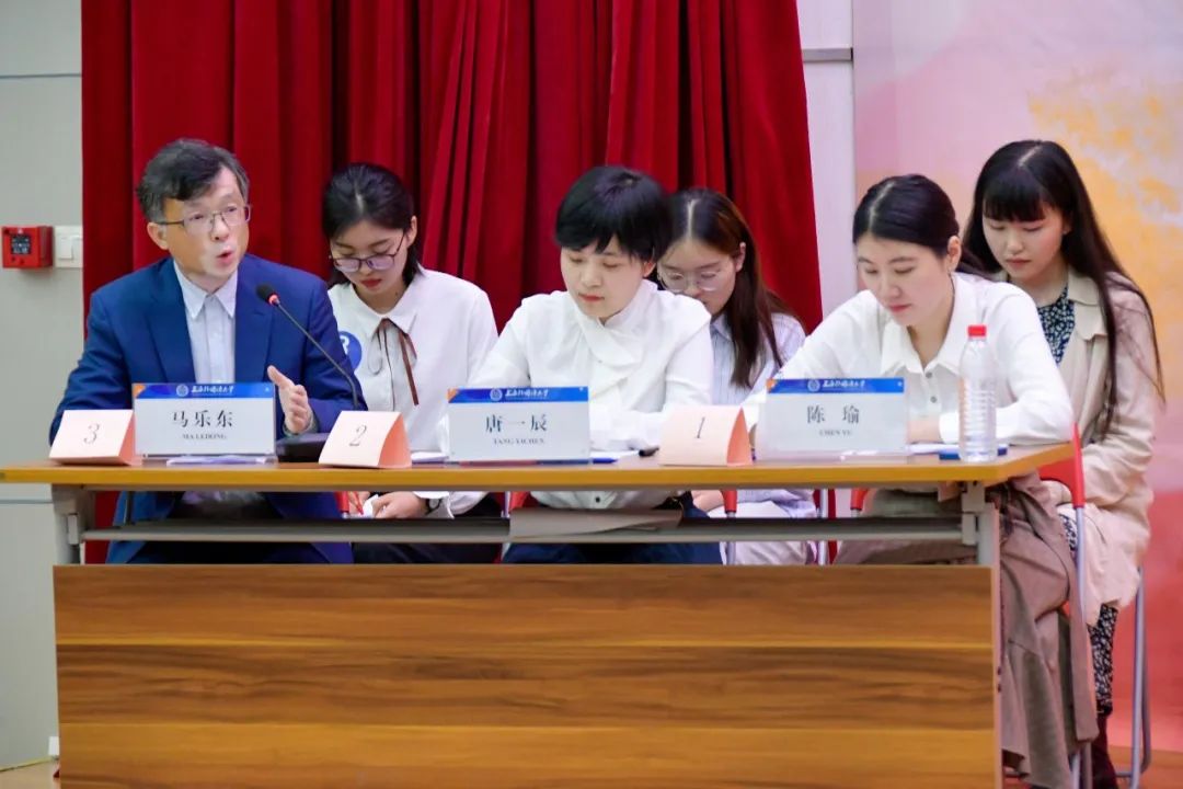 随后,王欣老师宣布口译大赛开始。现场口译大赛是历届“方重翻译奖”的重头戏,比赛采取辩论和交替口译模式进行,来自英语学院和国际教育学院的6位老师组成辩论队,正、反方各3人,辩论上半场为中文,下半场双方互换立场后进行英文辩论,由口译初赛得分最高的6位同学,现场抽签后分别跟随一位老师进行交替传译。本届大赛的辩论主席是英语学院教师顾秋蓓,辩手为英语学院教师顾悦、庄驰原、陈瑜、唐一辰、马乐东和国际教育学院教师江小华。担任辩论口译赛评委的是王光林教授、王岚教授、肖维青教授、侯靖靖副教授、策马翻译有限公司洪晔女士和于斐女士。