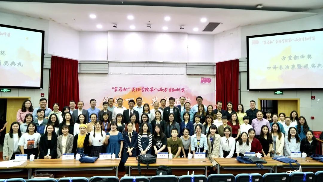 在颁奖典礼上,主持人揭晓“方重翻译奖”口译比赛和笔译比赛的各奖项获得者。在场的领导、嘉宾和老师分别为获奖学生颁奖并合影留念。