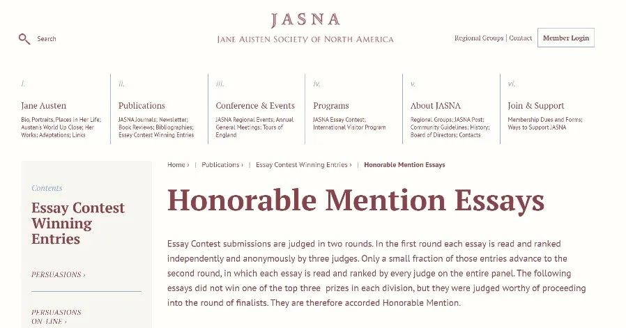 本次田珂源参加的美国简·奥斯汀协会征文比赛,是一项鼓励人们研究和鉴赏Jane Austen作品的国际写作赛事,面向全球所有高中生和大学生,每年都能吸引几百名各国学生参加,含金量高且难度较大。该比赛分两轮进行评审:第一轮由三位评委独立匿名为每篇文章打分,只有一小部分作品可以进入第二轮。进入第二轮的每一篇文章由评审团的每一位评委独立阅读并打分。