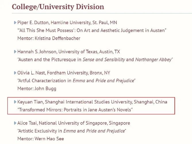 她的论文“Transformed Mirrors: Portraits in Jane Austen’s Novels”入选优秀作品合集后,被刊登在官网上,令她感到既兴奋又意外。虽然没有收到获奖确认邮件,但能从众多优秀作品中脱颖而出、成为Honorable mentions名单上的唯一的中国大陆学生,实属不易。回忆整个比赛过程,她坦言当时几乎只有一个月时间看书和准备,而选题和选作品都是当时面临的考验。在她看来,她最终经受住了这些考验,最重要是依靠平时的积累,多看书、多写作、勇于表达自己的想法,日常一点一滴的积累才会让她能在日后迈出成功的步伐。