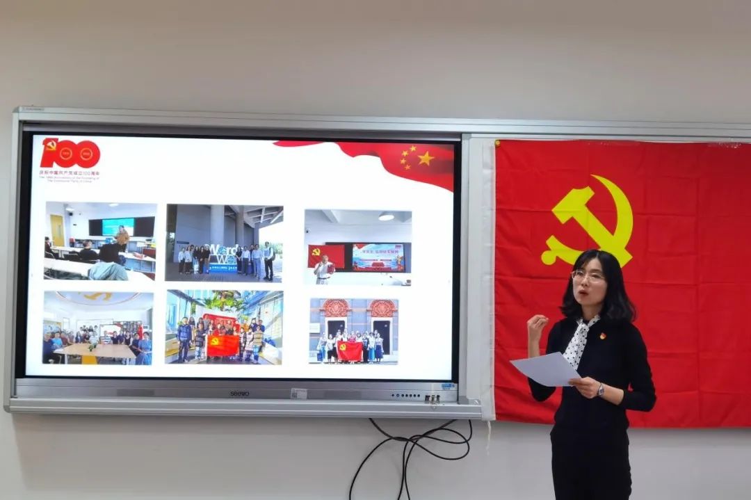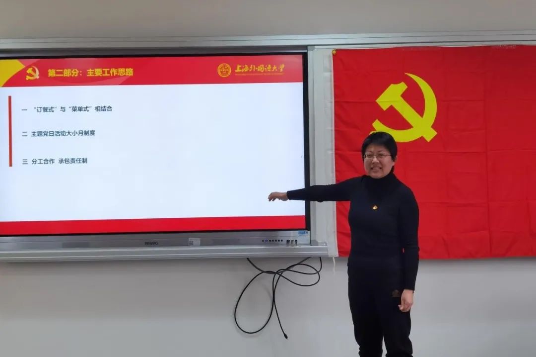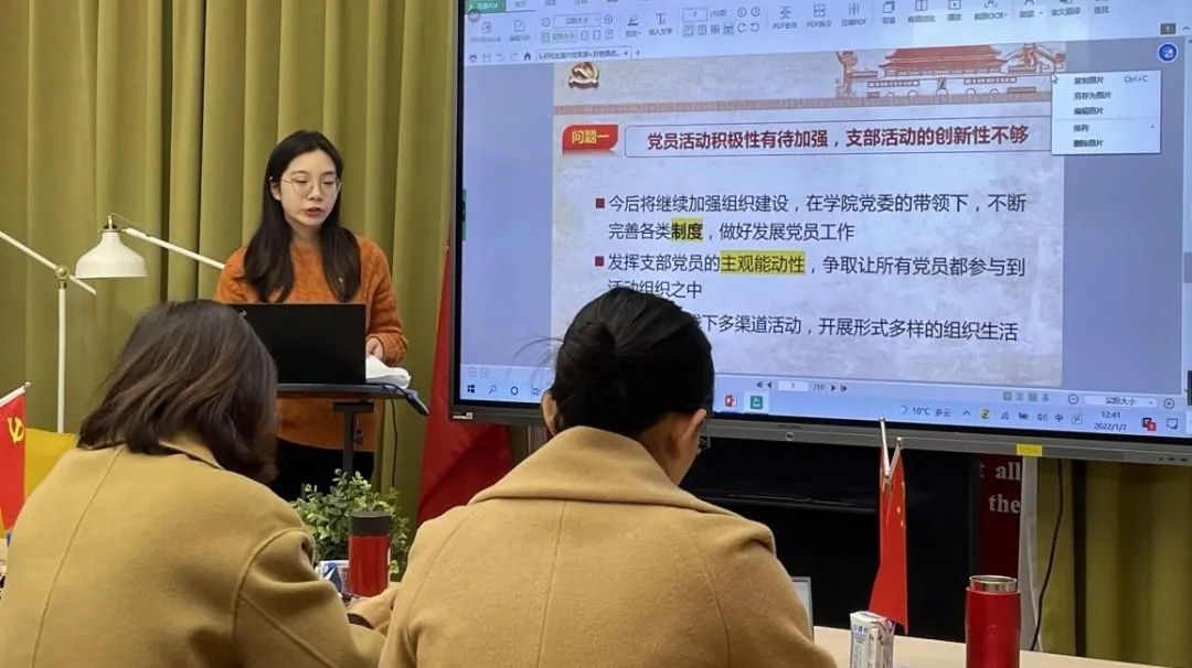 学院教工支部书记蔡佳颖、何春燕、赵阳和宋亮分别就2021年度抓基层党建和思想政治工作情况进行了图文并茂、案例丰富的现场总结。蔡老师介绍了支部在日常工作抓规范、亮点工作求创新方面的举措;何老师与大家分享了支部“菜单式”与“订餐式”主题党日活动开展、调动党员积极性参与支部建设方面的创新措施;赵老师对照“七个有力”介绍支部在样板支部建设方面的经验和成效;宋老师围绕“跨通融”分享了支部在管理育人、服务育人等方面做出的努力。