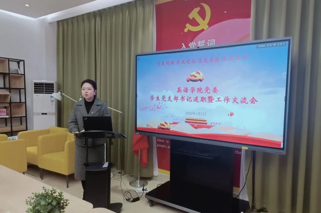 为深入学习贯彻习近平新时代中国特色社会主义思想和党的十九届六中全会精神,巩固党史学习教育成果,进一步压紧压实基层党支部书记责任,推动学院基层党建工作创新发展,英语学院党委召开教工党支部书记、学生党支部书记述职评议暨工作交流会,22名支部书记围绕主题、对照“七个有力”进行述职总结,与会师生就党建工作经验和年度计划进行交流。