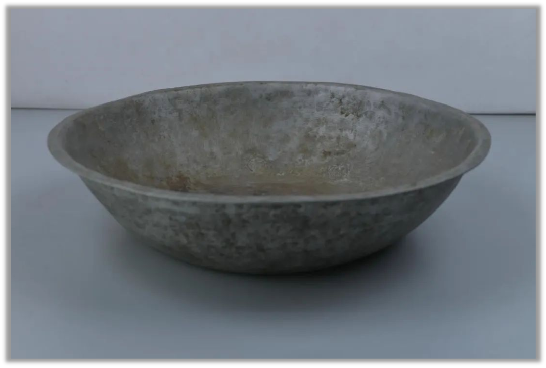 This silver-grey aluminium alloy basin was made by Gu Bokang from the wreckage of a Japanese airplane. There are two patches on the outside of the basin and two more at the bottom, measuring 20 and 10 centimeters in diameter respectively.