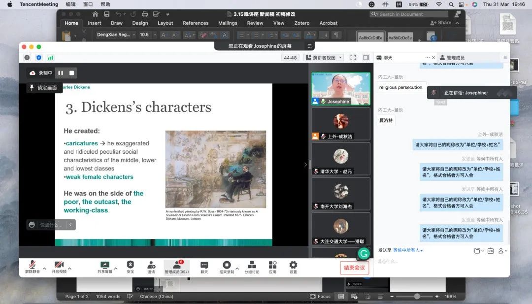 讲座的最后,蔡老师播放了她主讲的中国大学慕课同名课程片段,以文本与影视作品相结合的方式,鞭辟入里地解析了狄更斯对其作品中多个角色细致入微的刻画。参会的各高校同学和老师们也积极参与互动,并在留言板块提出多个问题。