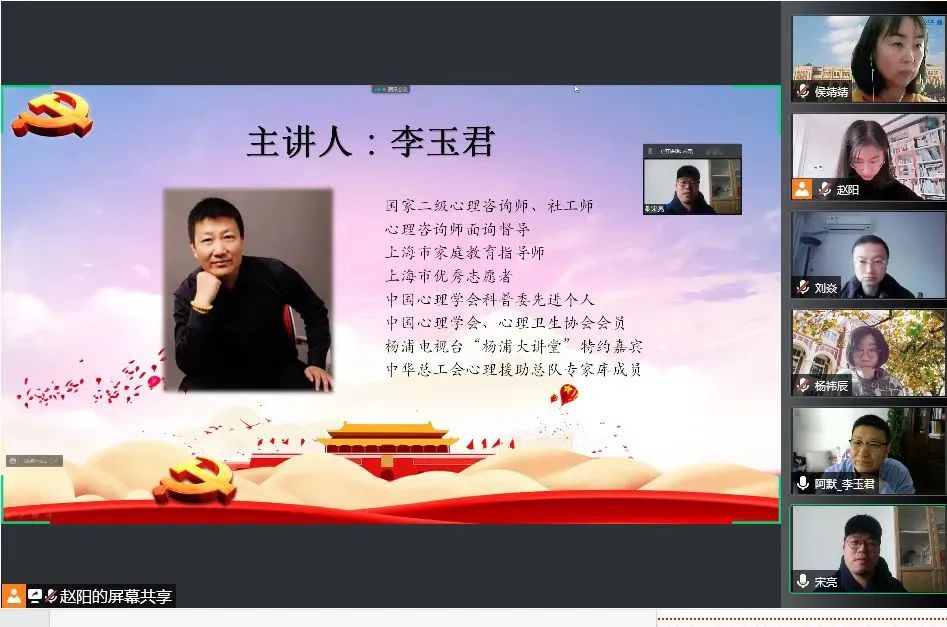 教工第三党支部书记赵阳老师介绍了本次活动的主题,教工第二党支部书记宋亮老师向与会师生介绍了李玉君老师的专业背景。李老师是国家二级心理咨询师、社工师、上海市家庭教育指导师,中国心理学会、心理卫生协会会员,中华总工会心理援助总队专家库成员,具有丰富的心理咨询经验,曾多次受邀参加杨浦电视台“杨浦大讲堂”栏目,获“上海市优秀志愿者”、“中国心理学会科普委先进个人”等荣誉称号。