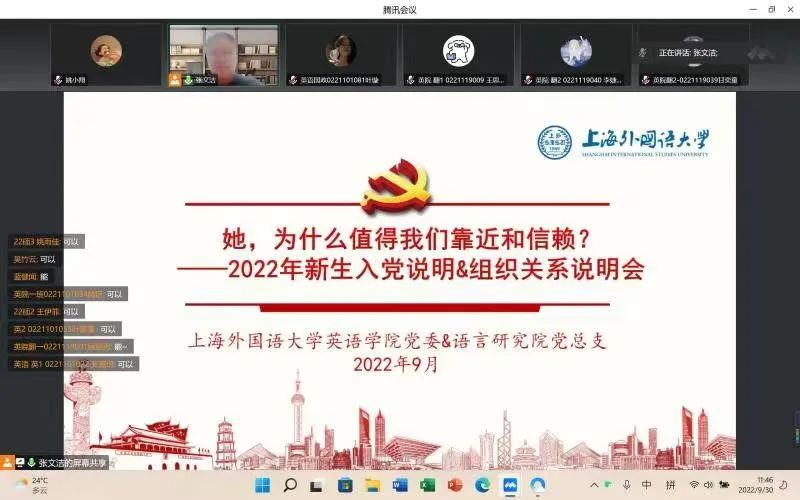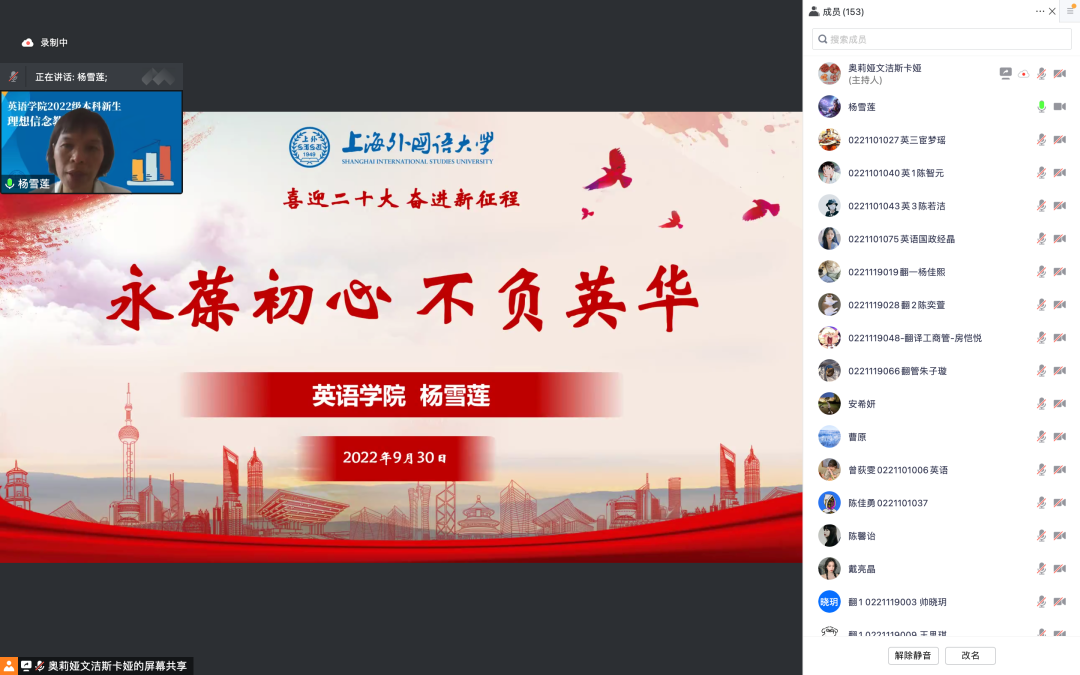 为进一步教育引导新生坚定理想信念、树立远大理想、增强爱国情怀,在人生的新起点上扣好第一粒扣子,2022年9月30日,英语学院开展线上新生理想信念教育暨入党教育活动。学院党委书记杨雪莲、党委副书记曹原、专职组织员张文洁、兼职辅导员姚小翔和全体新生参加大会。