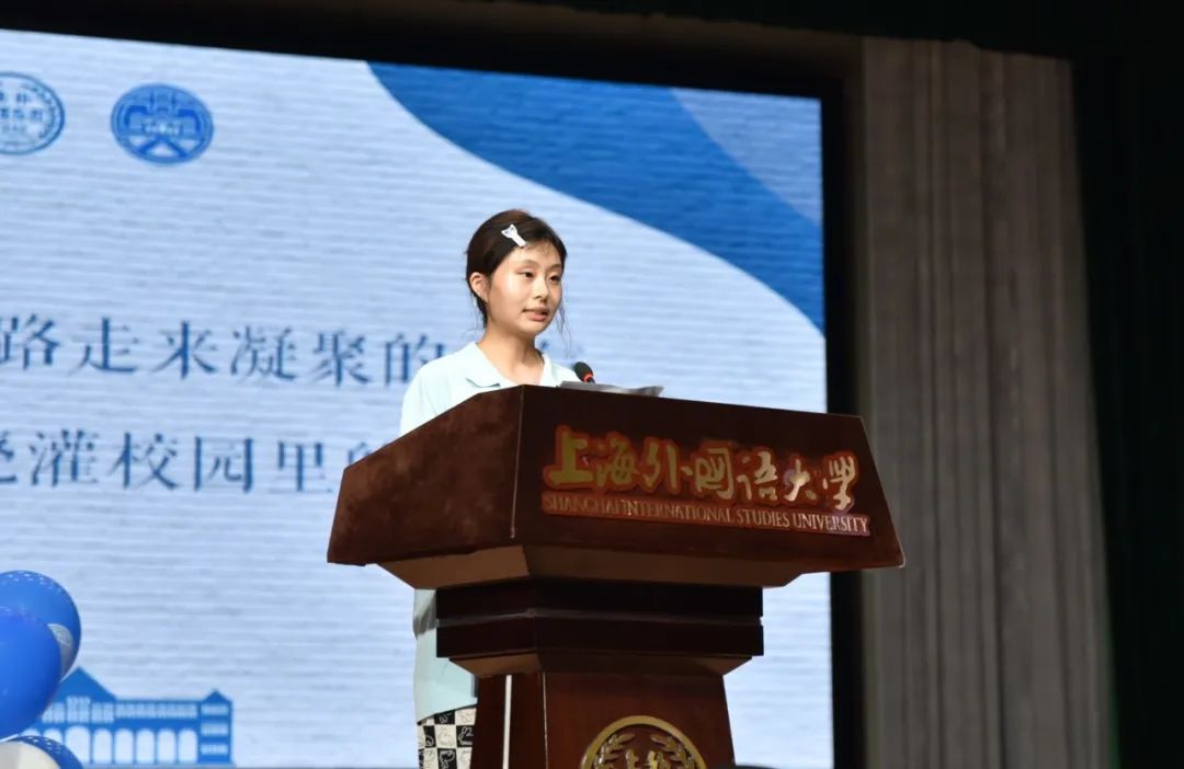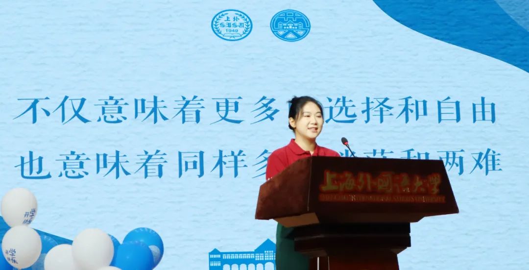 2023级硕士研究生王开元同学作为研究生新生代表进行分享。她谈起与文学的结缘、相互奔赴和思想的碰撞,认为持久不懈的学习、独立自主的思考会帮助我们在学习上取得更大成果。她代表全体新生表示,要立志做一名“语言能力精湛、人文学养深厚、思想能力突出、中外文化融通、跨文化传播能力卓越”的英华人,在上外英院这一新起点上,昂首迈向新征程。