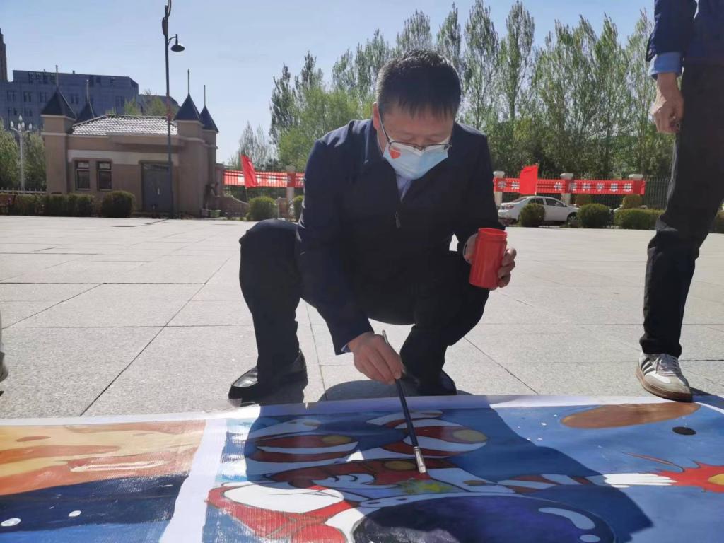 14时,蓝色,黑色,白色……各种颜色在地面上反复交织,伴随着《没有共产党就没有新中国》的悠扬旋律,一幅百米长卷在特殊教育学院广场徐徐展开,特教广场的同学们手握画笔,勾勒各种线条,不同颜色再次碰撞,他们的想象力在这里迸射。忽而深思的脸庞,凝重的眼神都在叙他们的思考,咔——一声声自拍的声音传荡开来。无声的世界里,他们以画传情,银河系、宇航员、火箭、宇宙飞船,一幅幅精美画面伴着同学们的笑脸在五月的春风中荡漾。