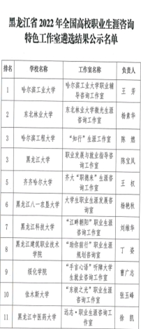 根据黑龙江省大学生就业创业指导中心《教育部学生服务与素质发展中心关于开展2022年高校职业生涯咨询特色工作室建设工作的通知》,共11所高校入选此次立项项目,将通过在全国高校就业创业指导教师网设立专区展示、开展专题研讨和培训等多种方式,推广各高校职业生涯咨询工作室的建设成果和经验,提升全国高校就业指导工作专业化水平。