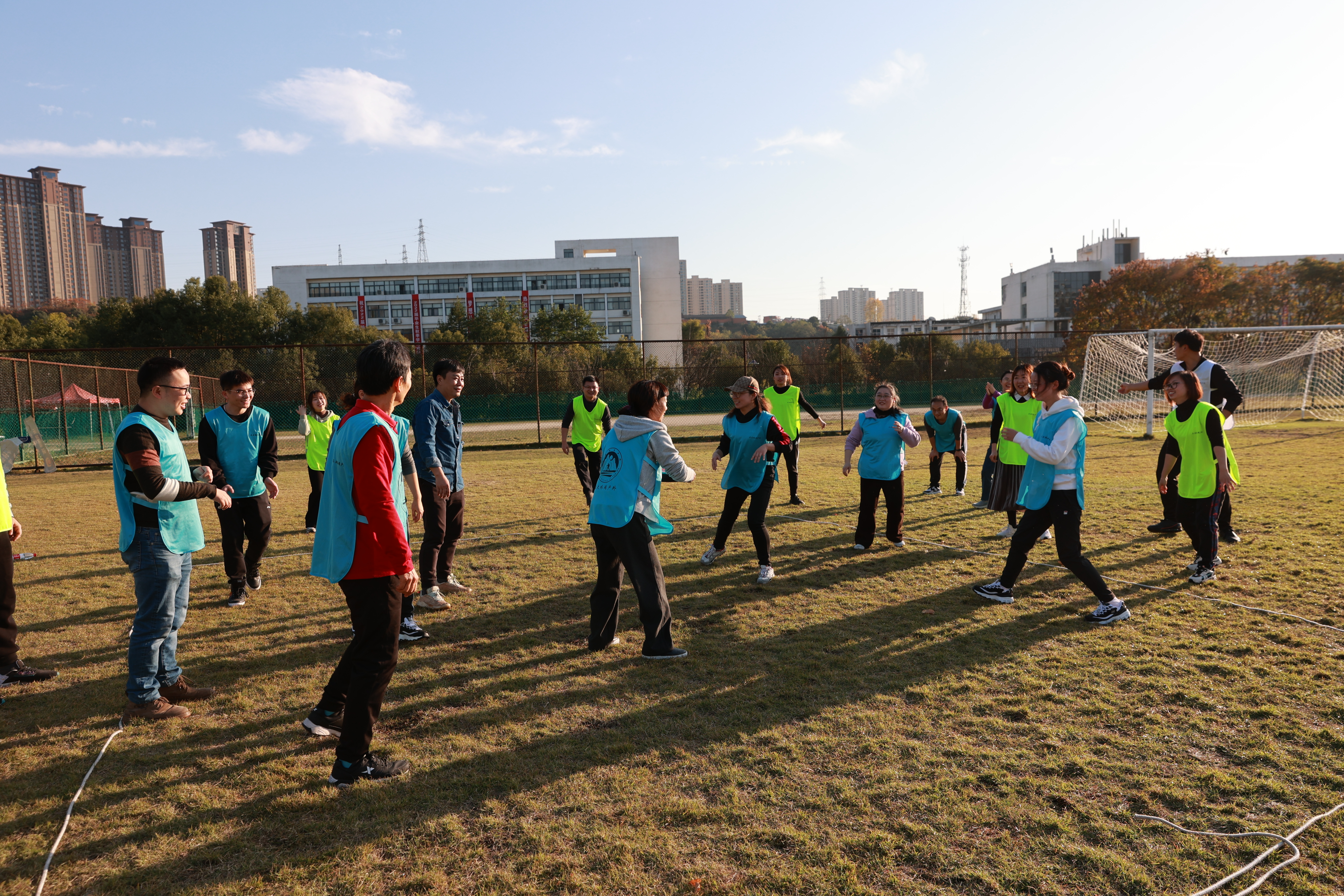 11月24日下午,东苑足球场阳光明媚,现场一片欢声笑语,学工团委党支部和体育学院、经管学院党支部在开展以“飞盘”为项目的支部党建学习活动。