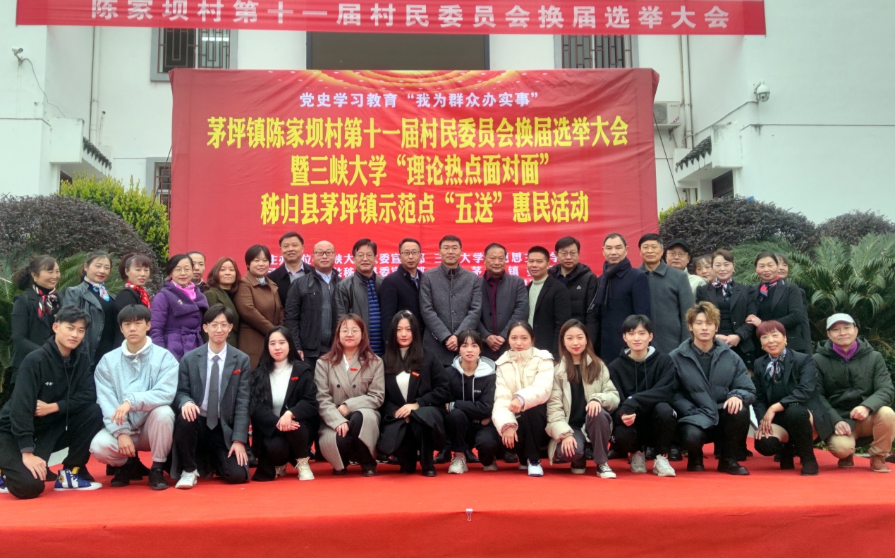本网讯(通讯员 吴言军 鲍秀丽 李政)为深入贯彻党的十九届六中全会精神,落实湖北省委讲师团《关于在全省理论热点面对面示范点开展“五送”惠民活动的方案》和党史学习教育"我为群众办实事"有关要求,12月8日,三峡大学党委常委、宣传部部长张锐,工会主席李敏昌率领马克思主义学院、经济与管理学院、法学与公共管理学院、生物与制药学院、艺术学院的师生近30余人走进学校"理论热点面对面"示范点秭归县茅坪镇,为当地老百姓开展了送理论、送法律、送技术、送文化、送致富信息的"五送"惠民活动。秭归县县委宣传部、秭归县茅坪镇政府办公室相关负责人和陈家坝村全体村民近1000多人参加了本次活动。