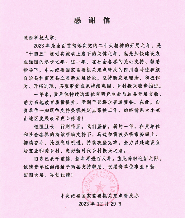 近日,我校收到中央纪委国家监委机关定点帮扶办发来的感谢信,对我校一如既往支持委机关定点帮扶工作、始终情系大小凉山地区发展表示衷心感谢,对我校研究生支教团在服务地圆满完成支教任务并受到干部群众普遍赞誉进行表扬。