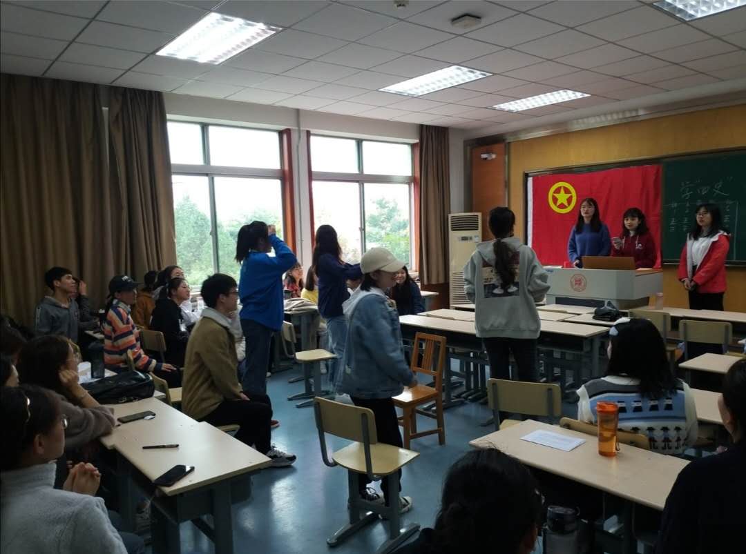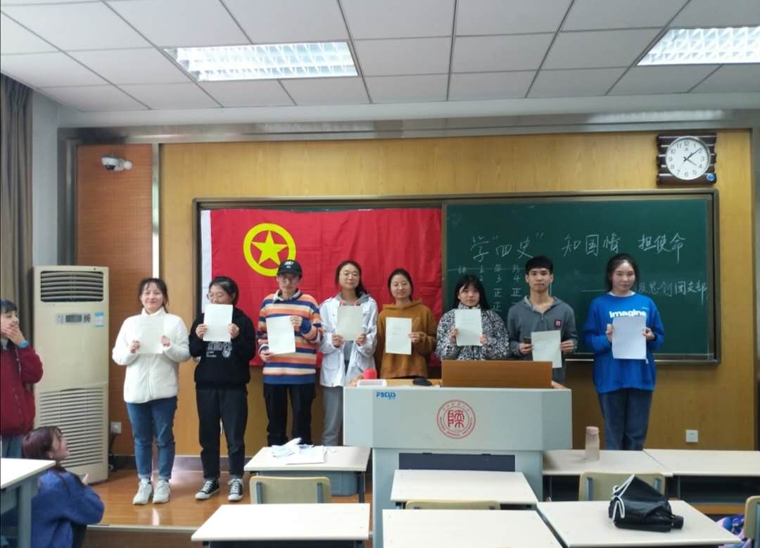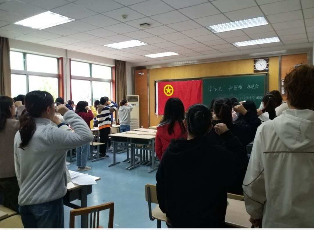 本次团日活动由三个环节组成。蒲星宇首先为大家介绍了学习“四史”的有关背景知识以及学习“四史”的重要性和必要性。接着由施慧慧带领全体团员面向团旗宣誓,重温入团誓词。蒲星宇对支部团员们在日常学习和生活中遵守团的章程、履行团员义务、严守团的纪律的自觉行为予以肯定和表扬。