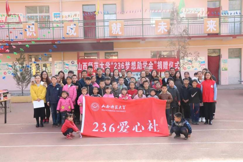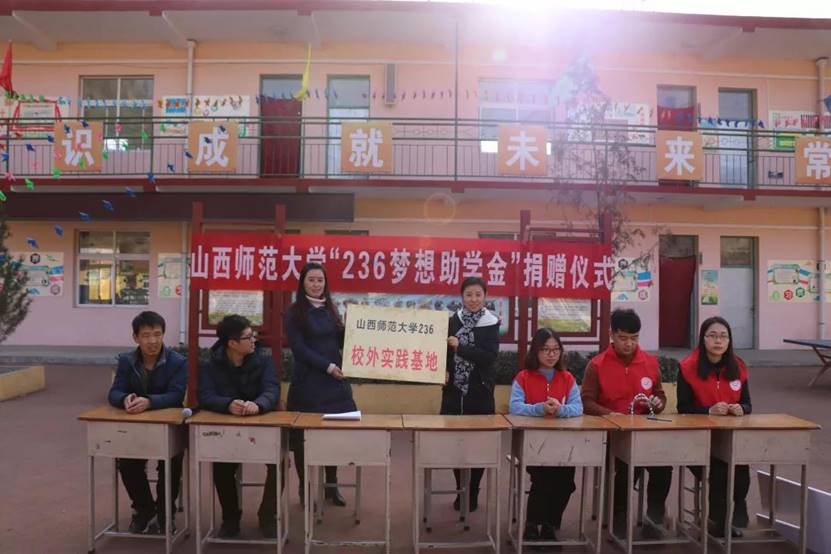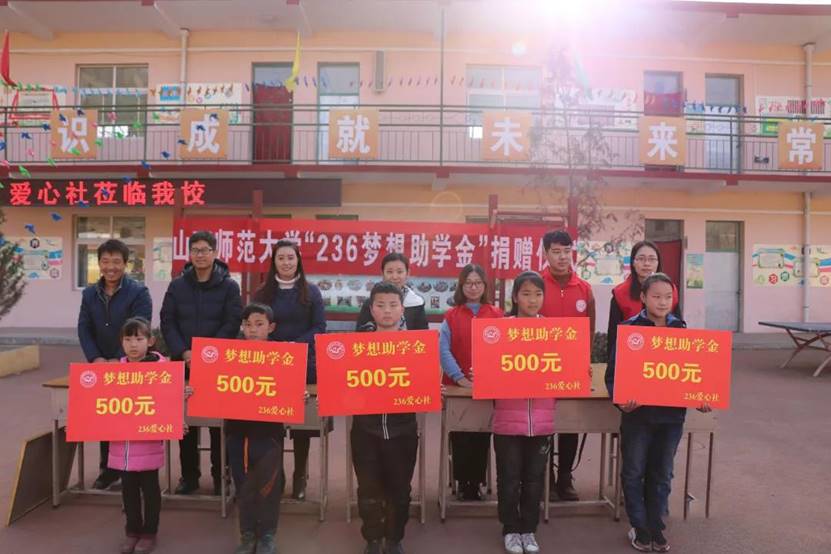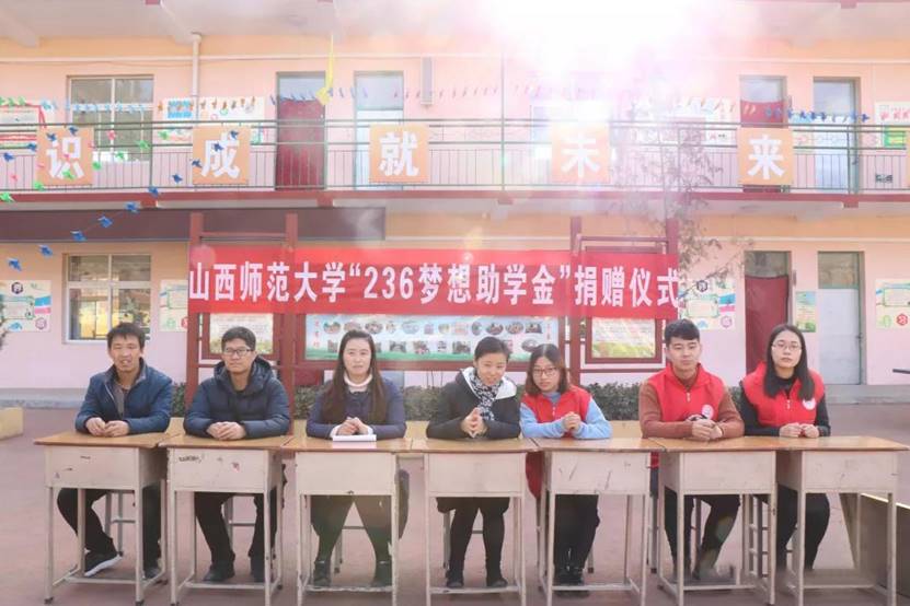 为积极响应国家精准教育扶贫号召,走好精准教育扶贫之路,传播公益爱心,2018年11月28日,山西师范大学236赴第三座“梦想书屋”所在地——大宁县三多中心小学捐赠梦想助学金。
