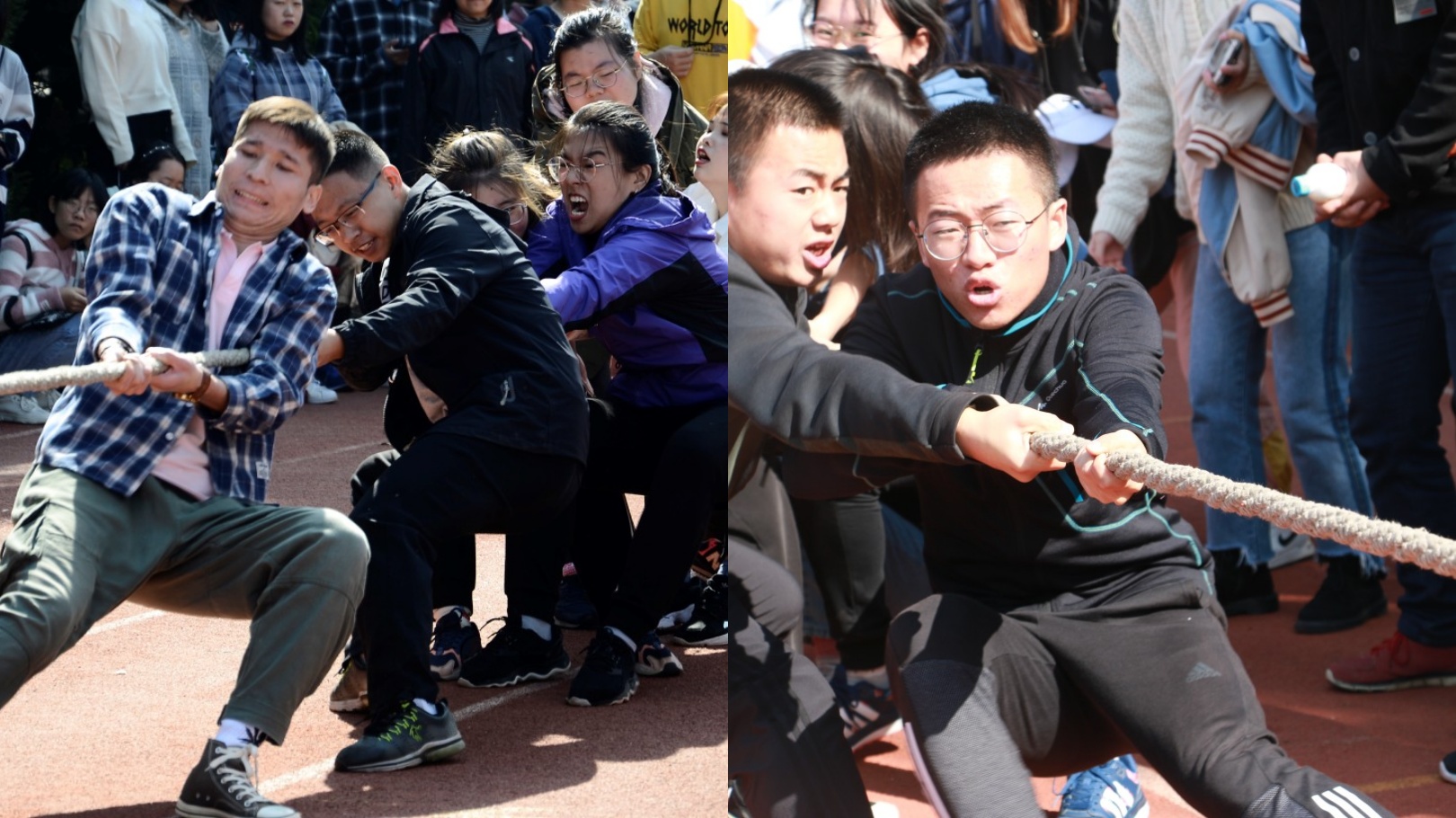 拔河比赛,队员们紧握麻绳,迸发力量;亲友团齐声呐喊,助威加油。