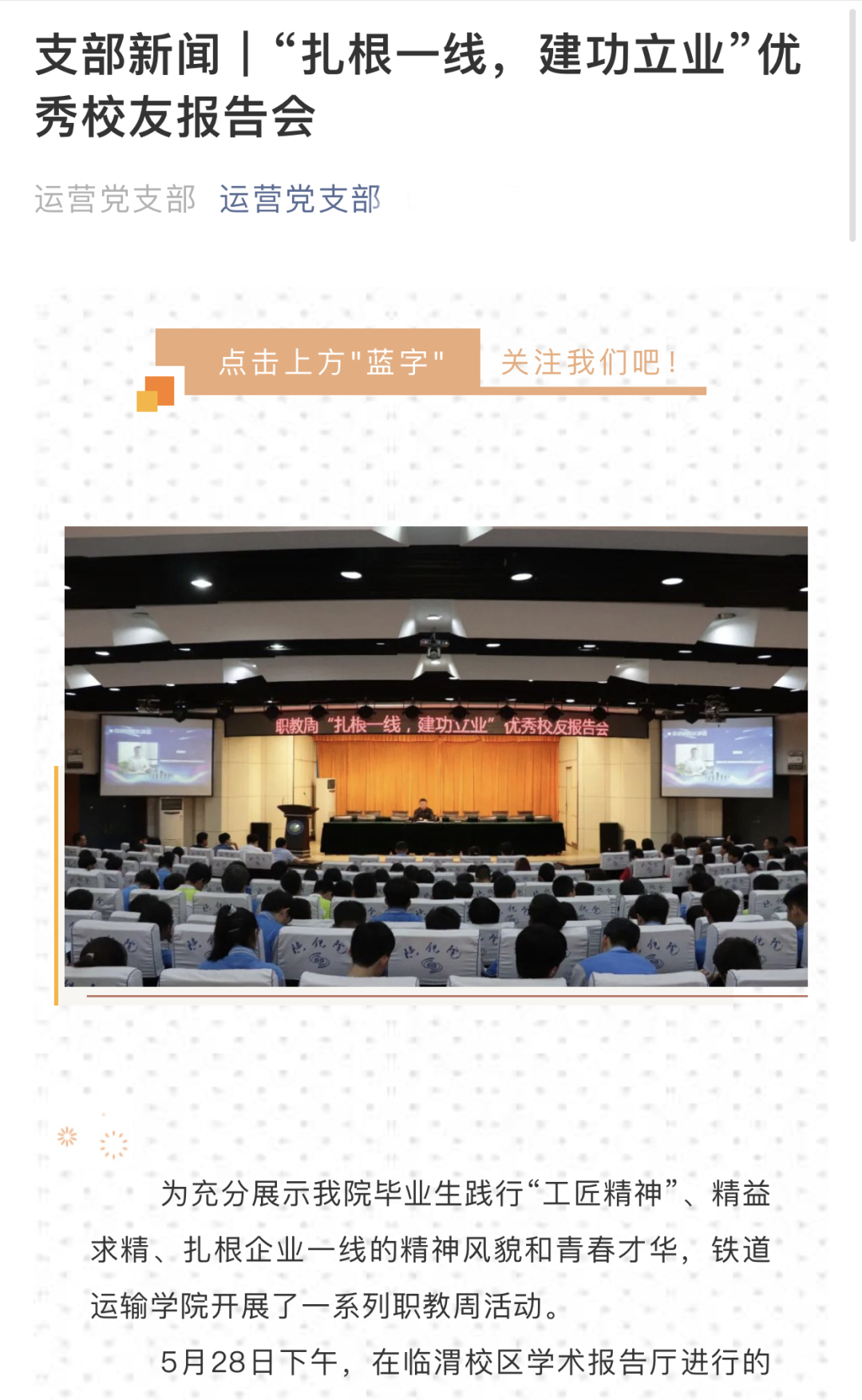 5月28日下午,在临渭校区学术报告厅进行的职教周“扎根一线,建功立业”优秀校友报告会中,运营党支部教授的优秀毕业生王开源参与汇报。