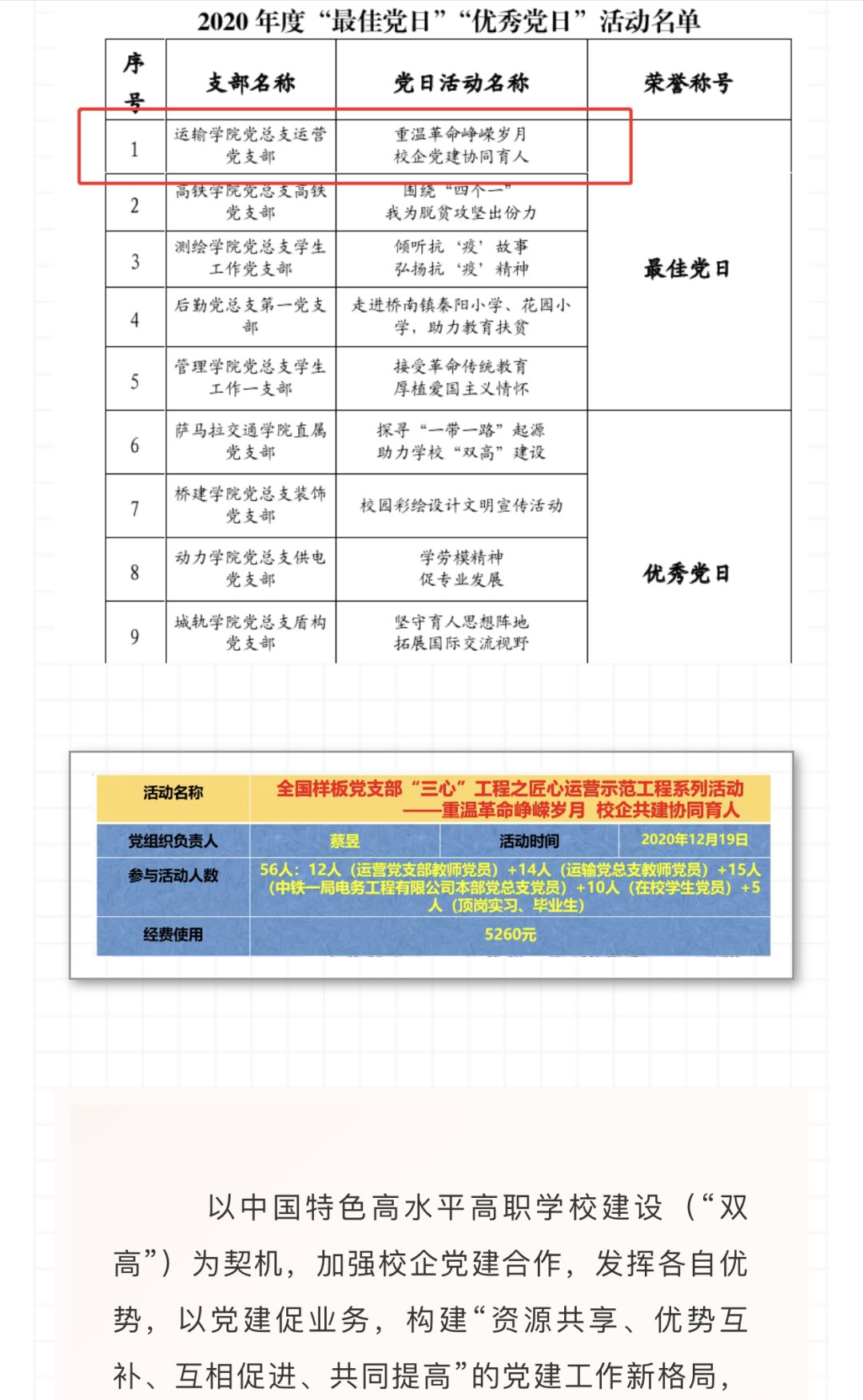 经评选,铁道运输学院运营党支部“重温革命峥嵘岁月,校企共建协同育人”校企党建共建特色党日活动荣获陕铁院2020年度“最佳党日”活动荣誉称号。