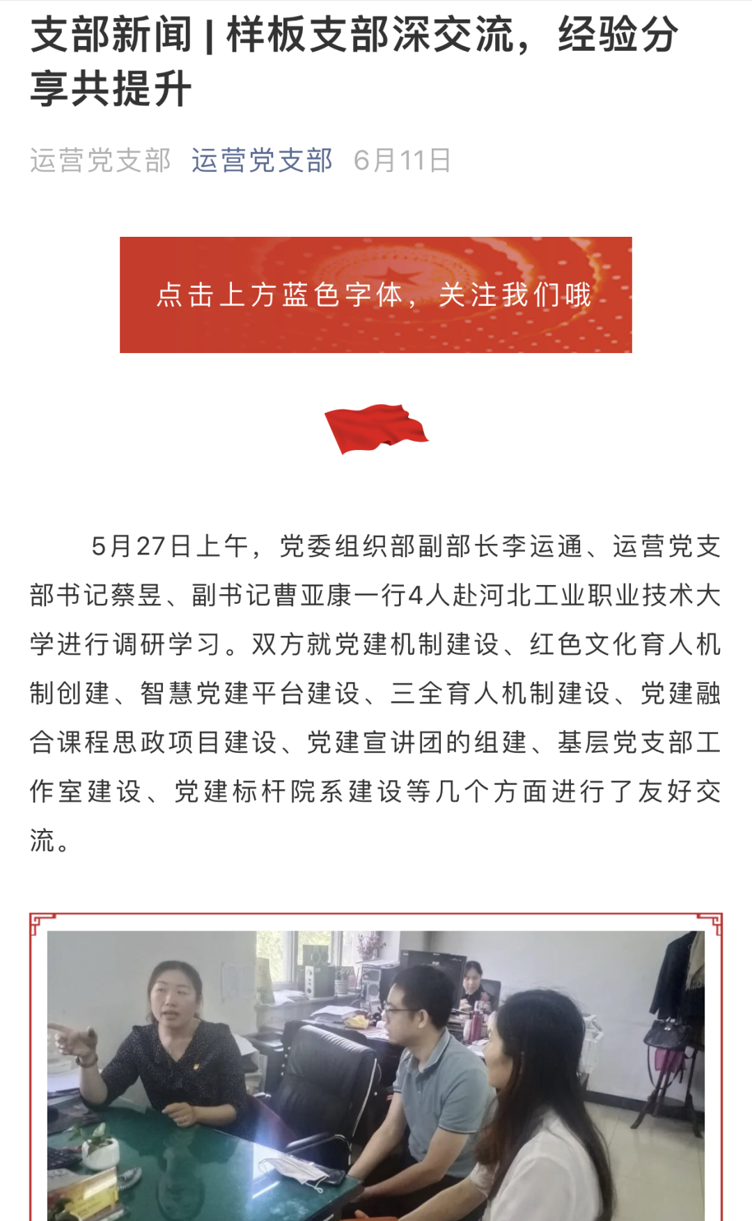 5月27日上午,党委组织部副部长李运通、运营党支部书记蔡昱、副书记曹亚康一行4人赴河北工业职业技术大学进行调研学习。双方就党建机制建设、红色文化育人机制创建、智慧党建平台建设、三全育人机制建设、党建融合课程思政项目建设、党建宣讲团的组建、基层党支部工作室建设、党建标杆院系建设等几个方面进行了友好交流。