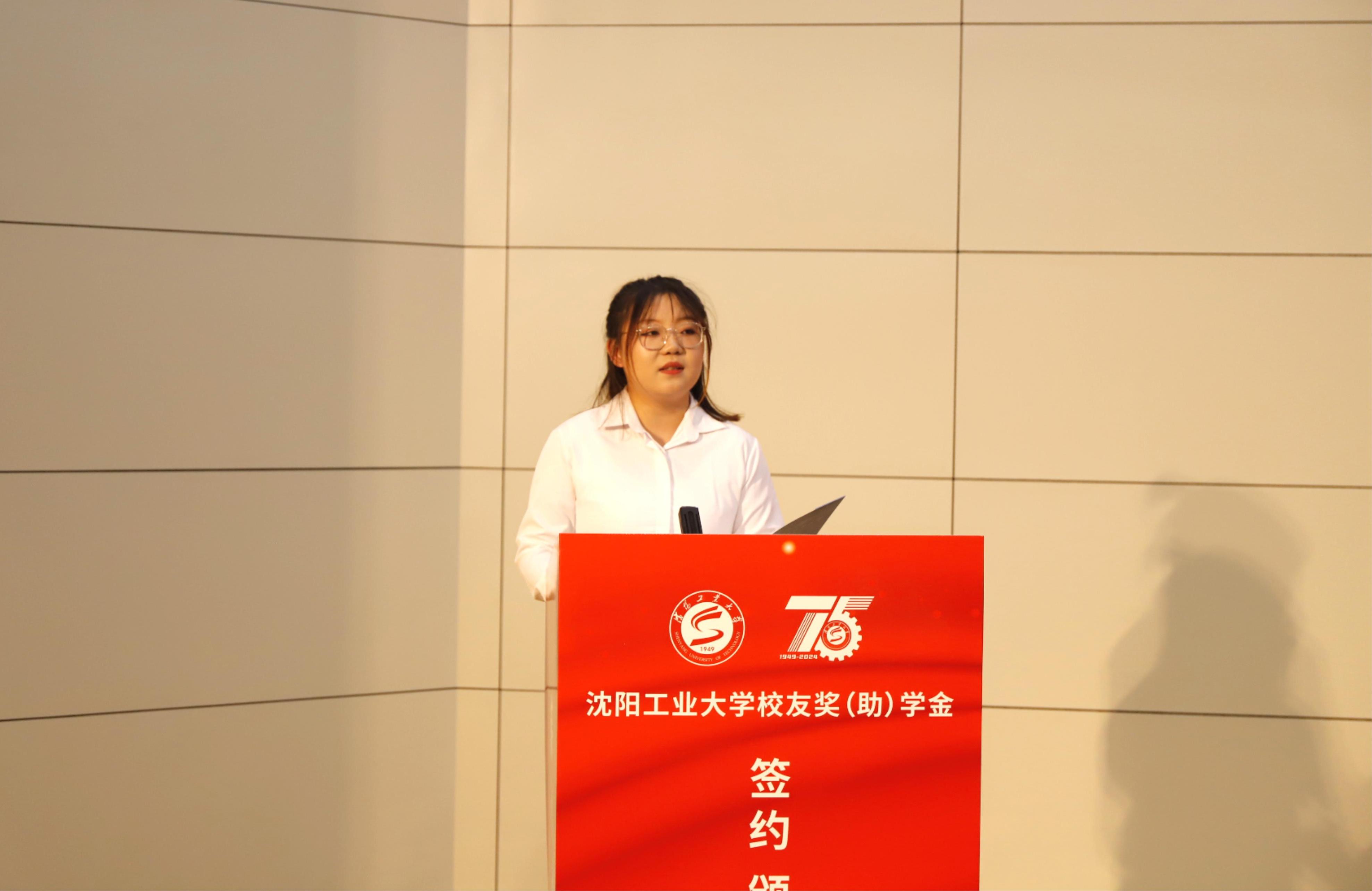 材料科学与工程学院曲晓涵、软件学院于震淏作为获奖学生代表发言。他们对校友企业及校友表示感谢,同时也分享了在校的学习及实践情况,并将以优秀校友为榜样,努力学习,全面提升自己,把关爱转化为实际行动,传承爱心,把这份温暖传递给更多人。