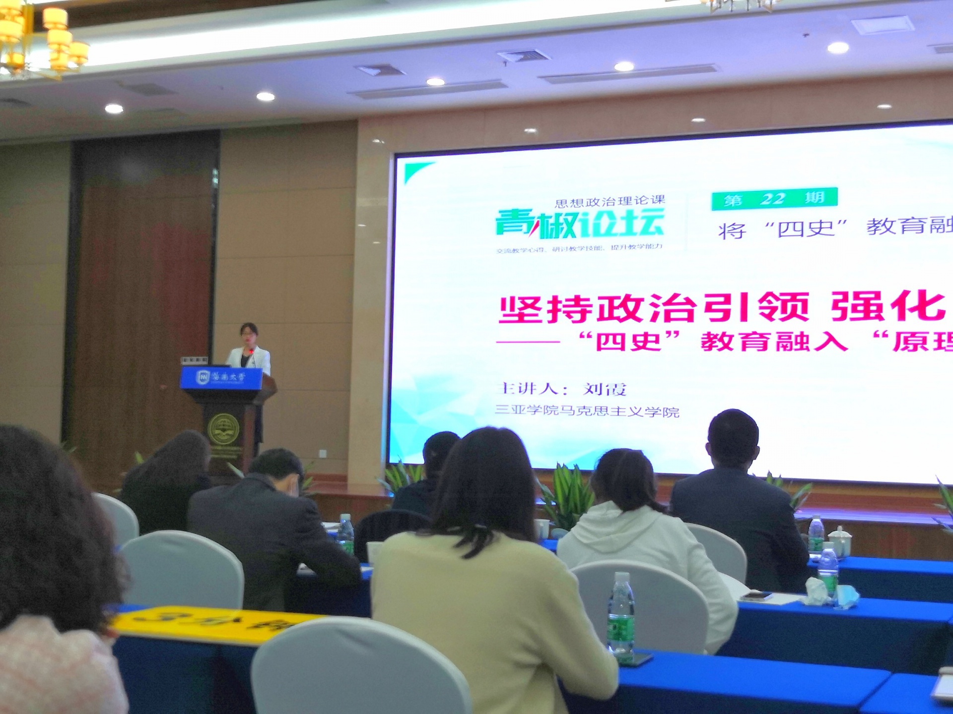 12月26日,“思想政治理论课青椒论坛”(第22期)在海口顺利召开。本次论坛是在北京市委教育工委、北京市教委、海南省教育厅指导下及全国 理论课教师网络集体备课平台支持下,由北京 理论课高精尖创新中心和中国人民大学马克思主义学院主办,海南大学马克思主义学院承办。本次论坛主旨是为贯彻落实习近平总书记关于加强党史、新中国史、改革开放史、社会主义发展史(以下简称“四史”)教育的重要指示精神,将“四史”教育融入思想政治理论课教育教学,引导大学生从历史和现实、理论和实践、国际和国内的紧密结合上,增进对中国共产党为什么“能”、马克思主义为什么“行”、中国特色社会主义为什么“好”的认识和理解,坚定道路自信、理论自信、制度自信、文化自信。论坛上来自北京、天津、四川、海南四地高校的8位优秀青年教师在论坛上围绕“将‘四史’教育融入 理论课教学”进行教学展示。海南医学院马克思主义学院苏玉菊教授和海南大学马克思主义学院赵福生教授担任评议专家。来自海南省22所高校的近百位思想政治理论课骨干教师现场参加了论坛。