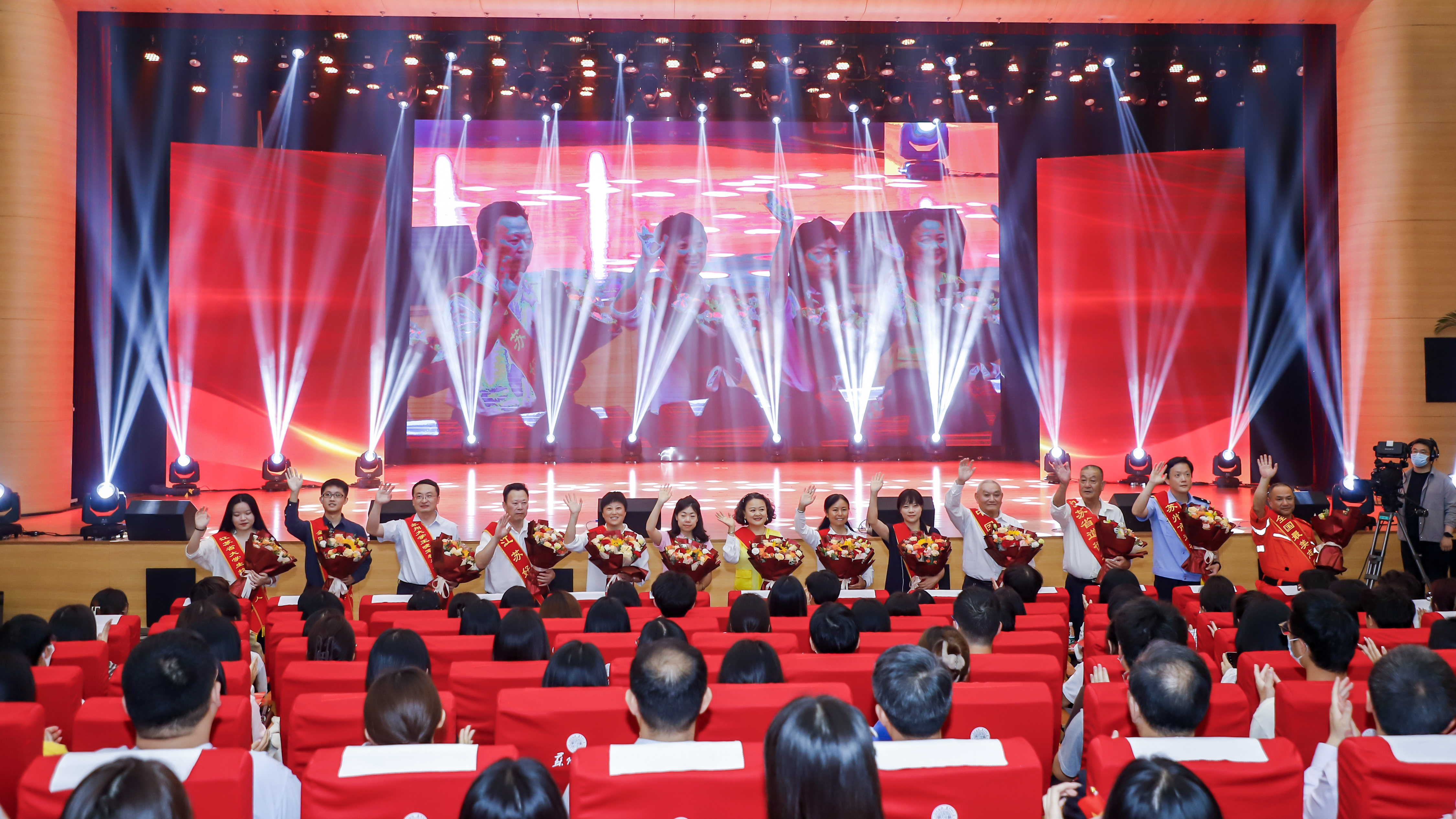 活动现场,观众们挥舞起手中的国旗,热烈欢迎获得全国道德模范提名奖、中国好人、江苏省道德模范、江苏好人、全国高校百名研究生党员标兵等荣誉称号的13位先进典型代表进入巡演现场,学生代表为他们献上鲜花和敬意。