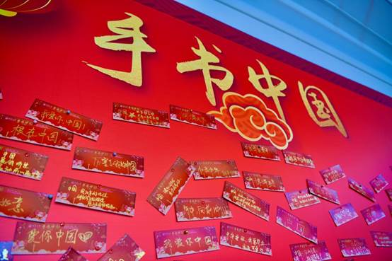 年夜饭现场,“手书中国”活动也受到了现场师生的热烈响应,老师同学们纷纷手写下“中国”二字,贴在展示墙上,真情告白伟大祖国!