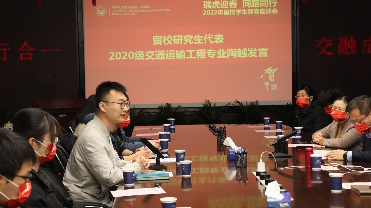 交通运输工程学院院长凌建明代表学院向寒假留校同学致以诚挚的新春问候。他首先回顾,2021年恰逢建党百年,国家综合运输交通网络规划纲要的出台也为学院发展带来新的机遇,学院在党建、人才培养、科学研究、社会服务、对外合作交流等方面都取得了喜人的成绩。这些成绩的取得,离不开学校各个职能部门的支持,离不开学院全体师生的努力。展望2022年,凌院长认为整体形势一定会比2021年更好。这个寒假,同学们或因为疫情影响、或完成学位论文、或因为实习工作等原因选择留在学校,虽然少了与家人团聚的热闹场景,但也多了与同学们一起过年的经历,二十年后这种经历将成为同学们美好的回忆。凌院长也寄语各位同学,留校期间多与父母家人联系,在校期间有任何困难或者需要都向辅导员、班主任、导师等提出来。最后,凌院长提醒同学们注意疫情防控、人身、交通等方面的安全,并祝福大家虎年吉祥、家庭幸福、学业进步,在学校度过一个健康安全的新年。
