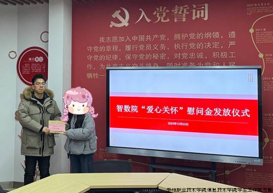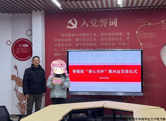 会上,张林老师向与会受资助学生介绍了智数院举行爱心关怀活动的意义和目的,鼓励同学们在校遇到困难及时与班主任和辅导员沟通,学院会尽可能的为大家提供帮助,解决大家遇到的急、难、愁、盼的问题。同时,希望同学们自立自强、勇于应对困难,强化知识技能学习、提升综合素质。随后,蔡伯峰教授和团委书记朱老师分别为两位受助学生发放了学院的爱心关怀资助。