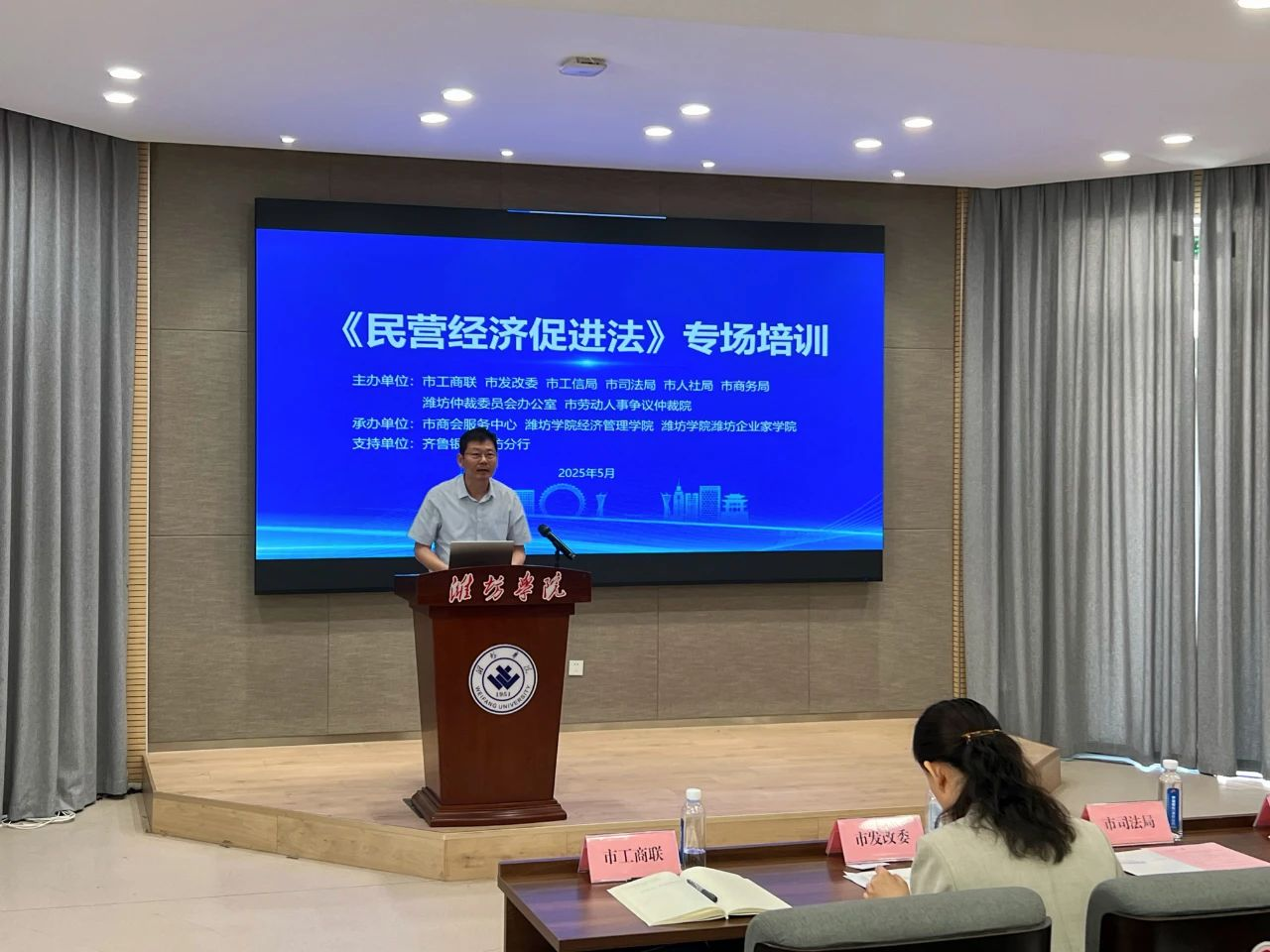 为深入学习贯彻习近平法治思想和习近平总书记关于民营经济发展的重要论述精神,切实推动《民营经济促进法》在潍坊落地见效,进一步优化法治营商环境,促进民营经济持续健康发展,本次培训活动特邀山东万信律师事务所主任左爱民,潍坊仲裁委员会仲裁员,山东第二医科大学卫生法学系副主任周建裕,潍坊市劳动人事争议仲裁院立案调解庭庭长刘虎波作专题授课。市工商联党组成员、副主席王永刚主持培训,市工商联党组成员、秘书长、三级调研员吴锦霞,潍坊学院潍坊企业家学院执行院长马学军,相关部门、单位分管负责同志及业务科室负责同志,奎文区、潍城区、寒亭区工商联、高新区党群工作部负责同志,市工商联执常委企业代表,各直属商会代表及调解员等100余人,我市96家民营企业参加培训。