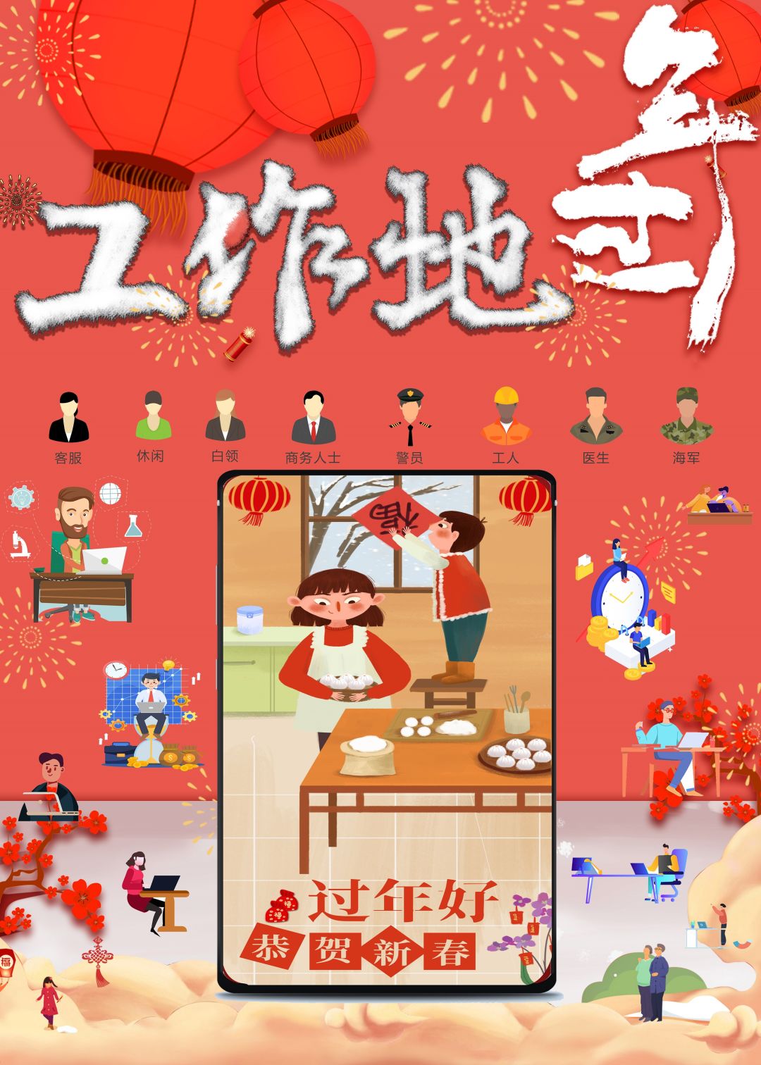 “工作地”三个字突显出独特且新颖的过年方式。用一些正在工作的场景来作为小图标,表现突出新年之际大家也不忘工作,努力奋斗的场景。