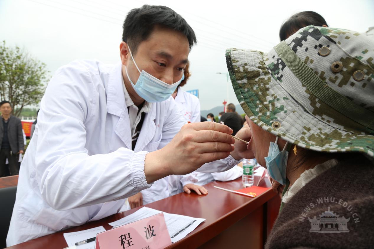 95岁的聂忠德是红安的一名复员军人,曾参加抗美援朝上甘岭战争,当过班长,负过伤,他也是义诊现场年龄最大的患者。中南医院的医生为进行测量血压等后,发现聂老血压偏高,还有腹泻等问题。医生将控制血压和治疗腹泻等药物赠给聂老,并嘱咐他按时按量服药,如有其他不适随时复诊。